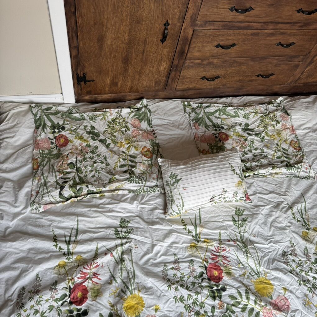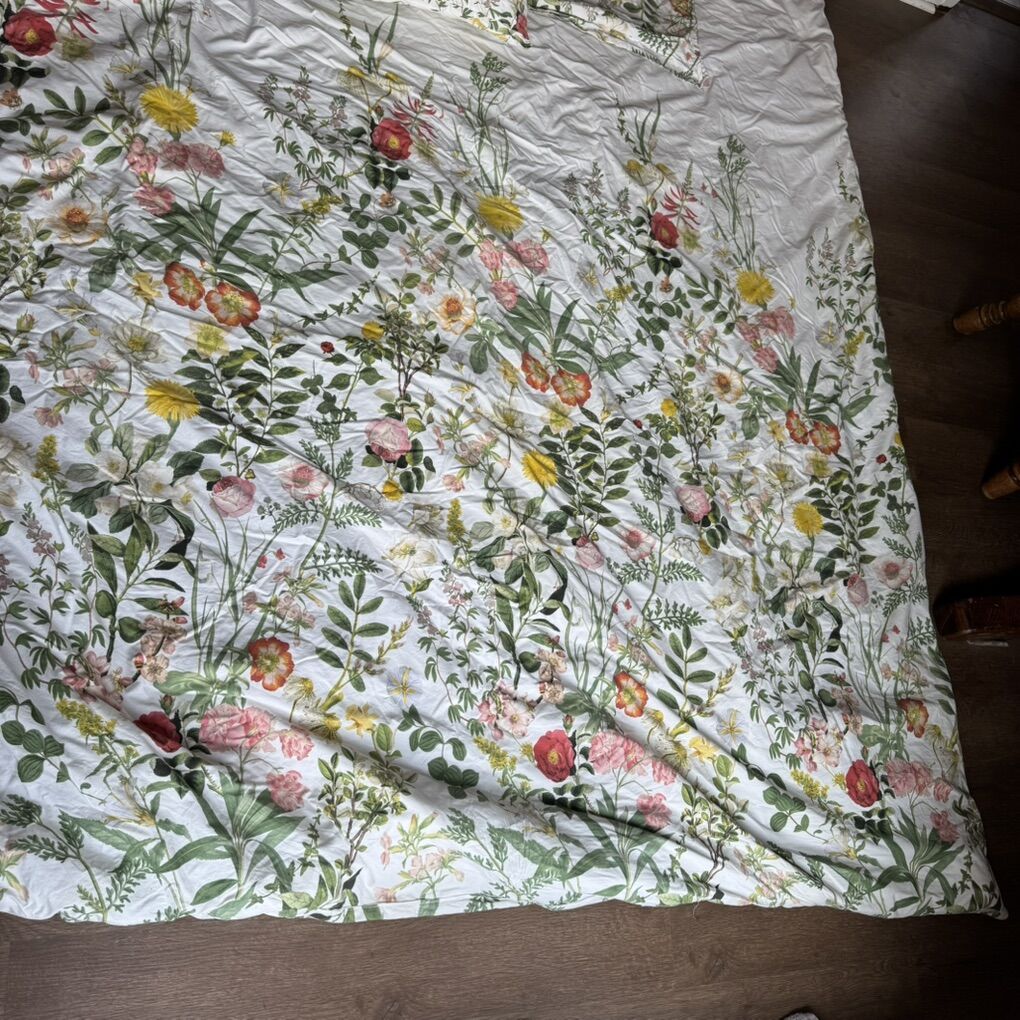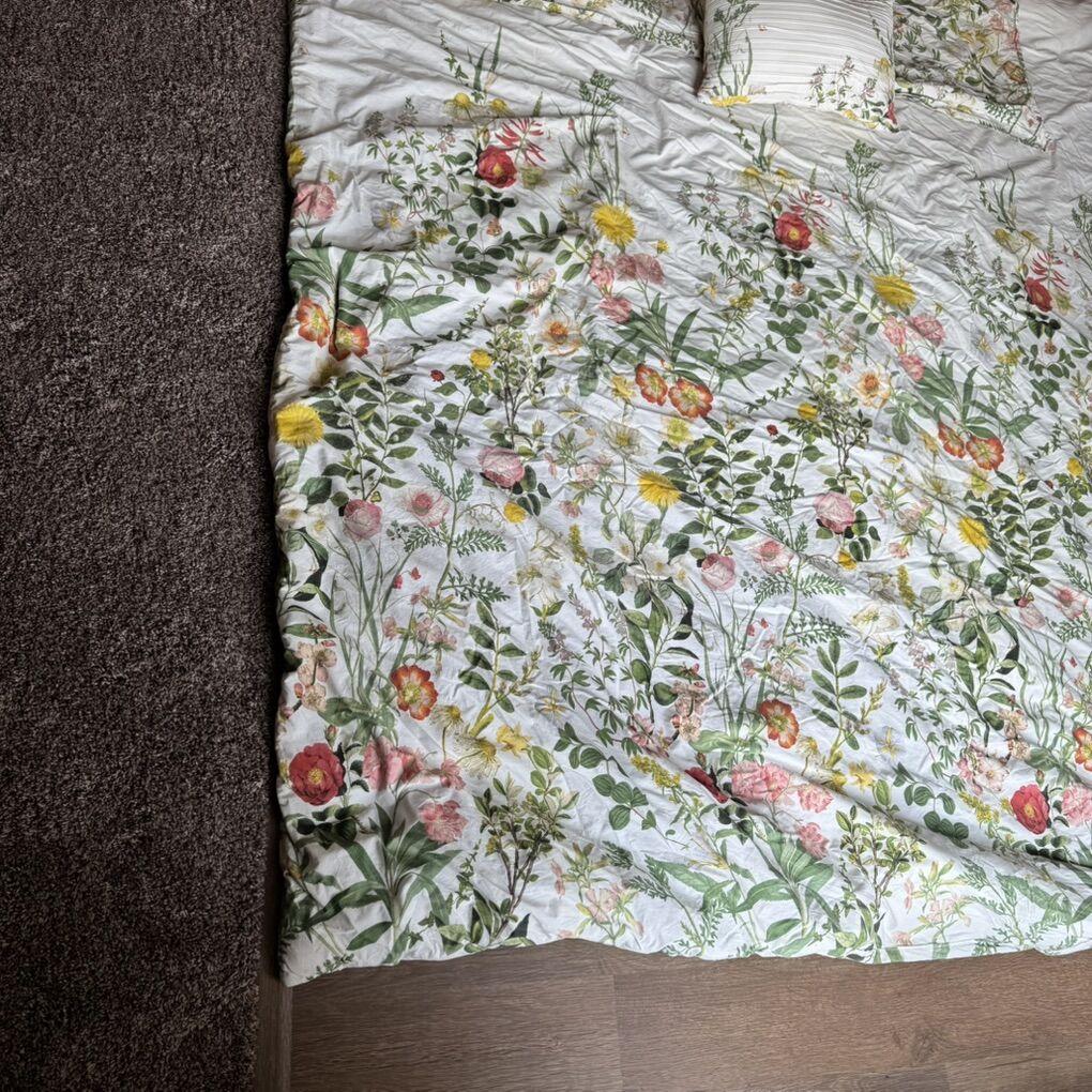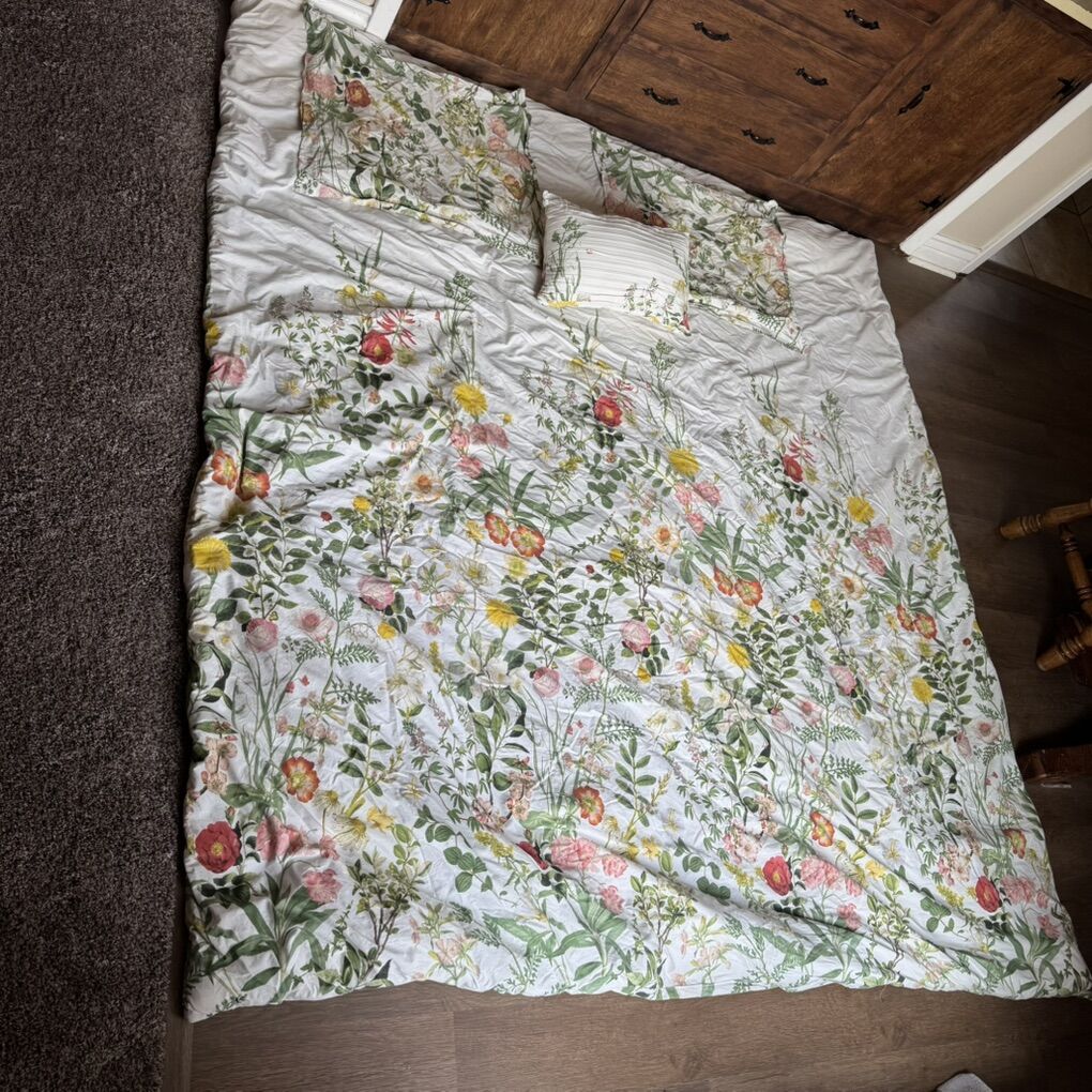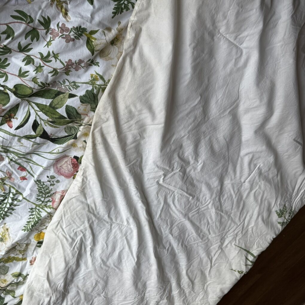 En Vogue Garden Floral Print Comforter Queen/Full It does have some stains throughout it from washing in the washing machine and the filling is a bit lumpy inside