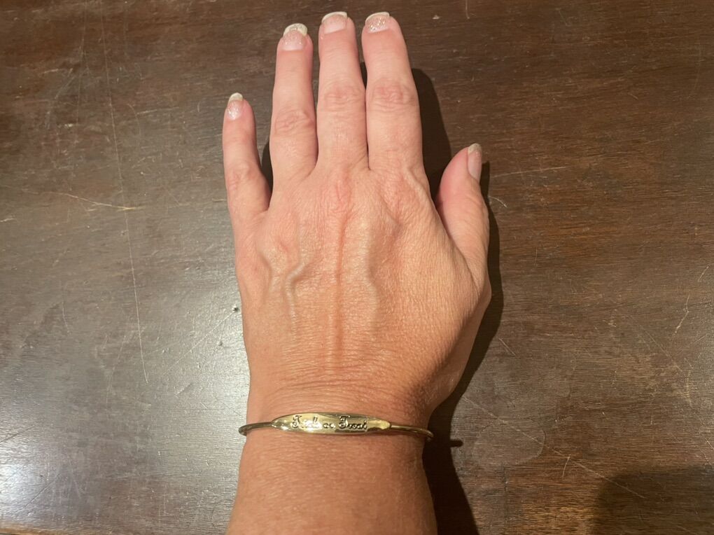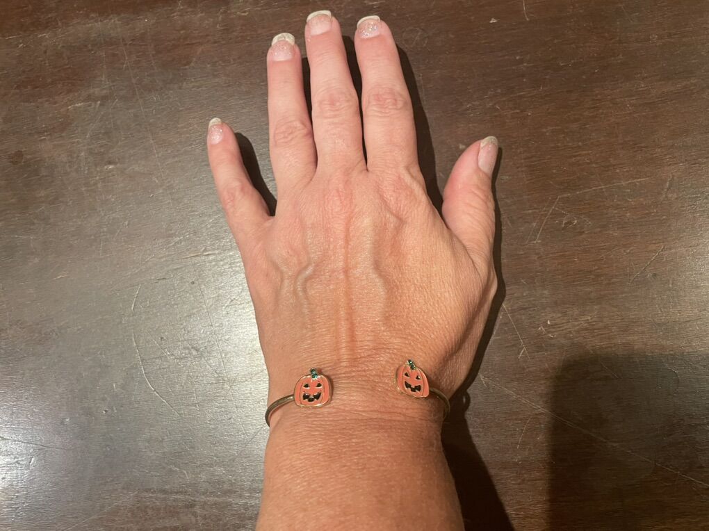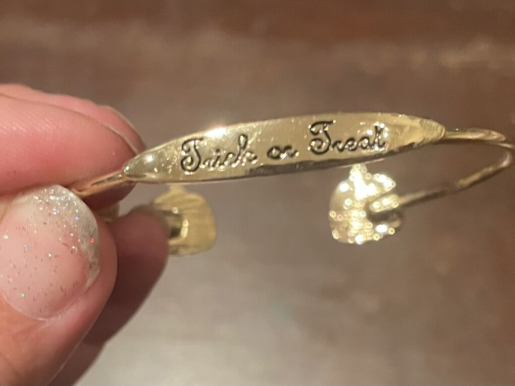 I have a cuff bracelet with an orange jack-o-lantern on each end. The middle says Trick or Treat in script or cursive. The metal is gold colored but I don’t see any metal content markings so I don’t know what the metal actually is. See my other ads for jewelry, artwork, home decor and more.
