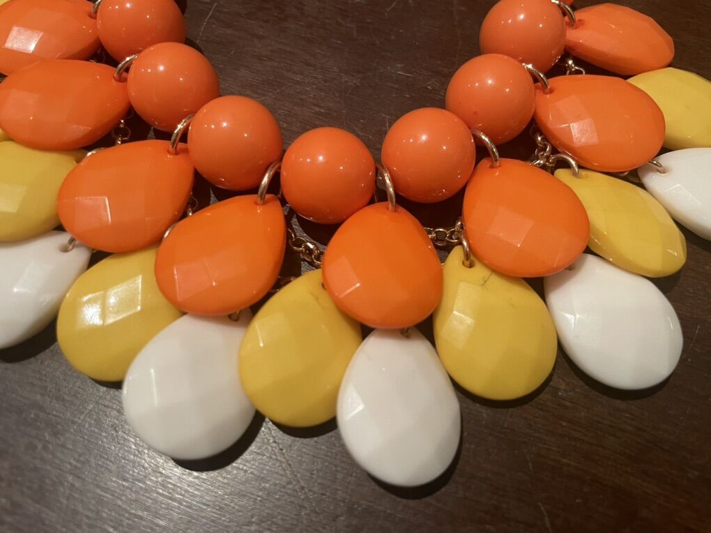 I have a fun necklace with layered round and teardrop beads that are orange, yellow and white. The metal is gold colored. See my other ads for jewelry, artwork, home decor and more.