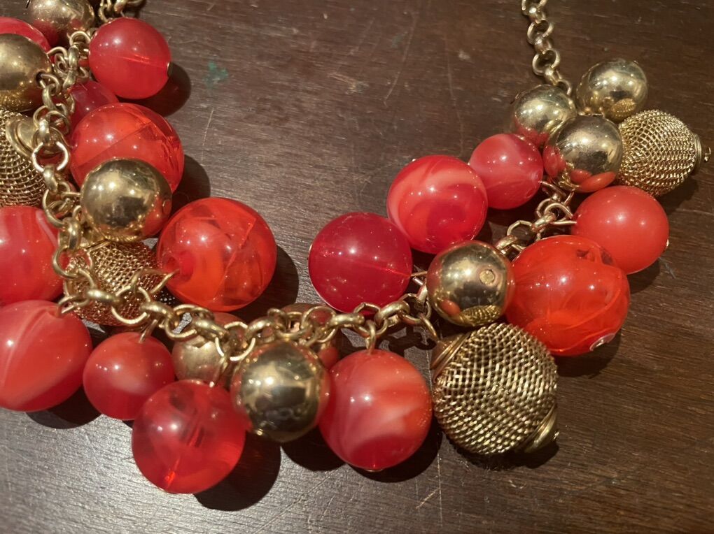 I have a chunky necklace with large round red and gold beads. Some of the gold beads are solid and some are more decorative. The metal chain part of the necklace place is gold tone. See my other ads for jewelry, artwork, home decor and more.