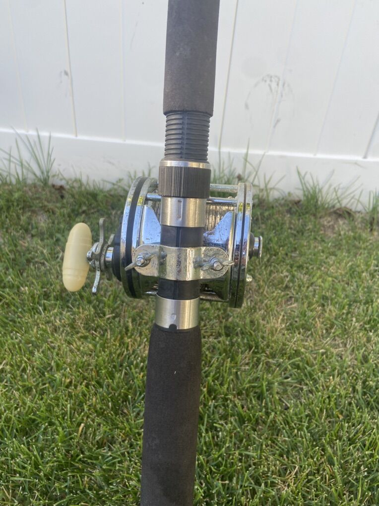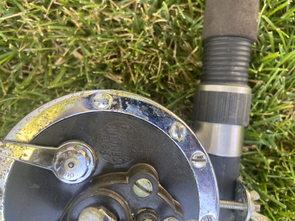 Reel: Penn Senator 9/0 • Classic white handle • High-capacity, heavy-duty saltwater reel • Smooth drag and solid clicker • Tested and working condition • Made in USA – trusted by generations of offshore anglers