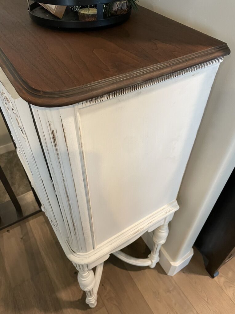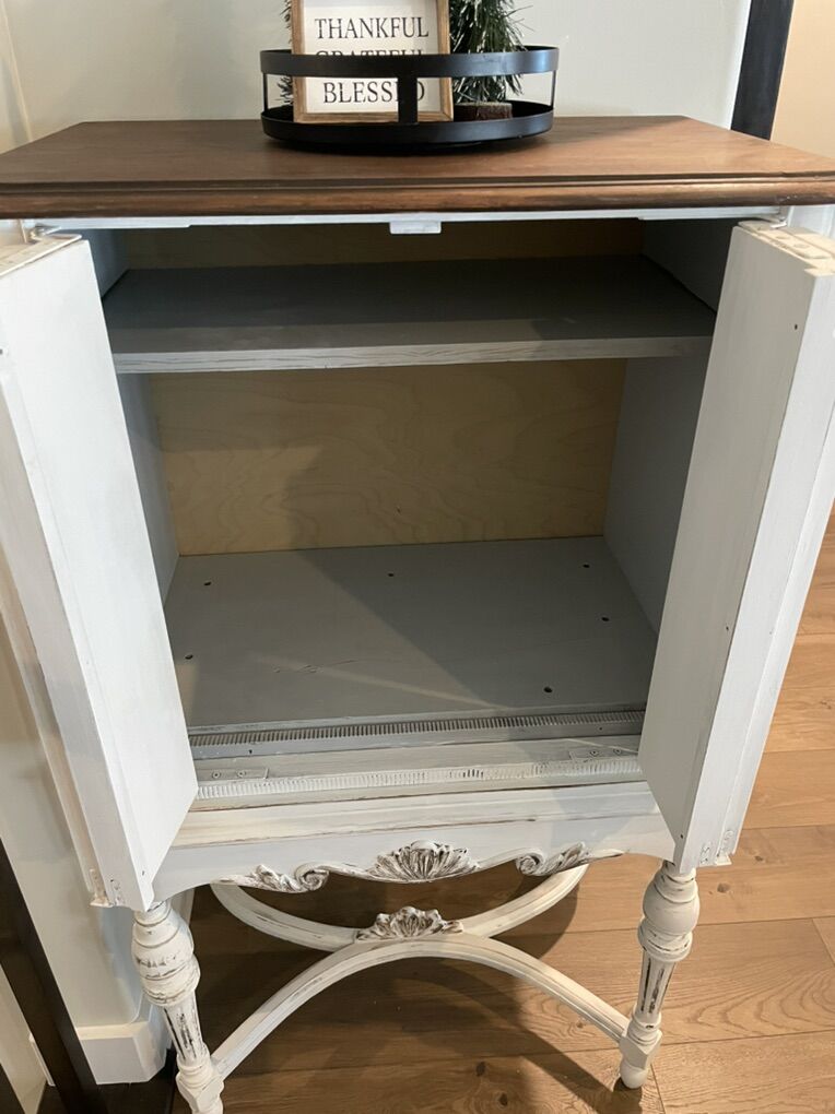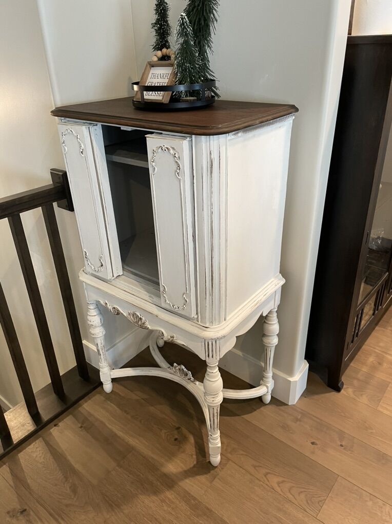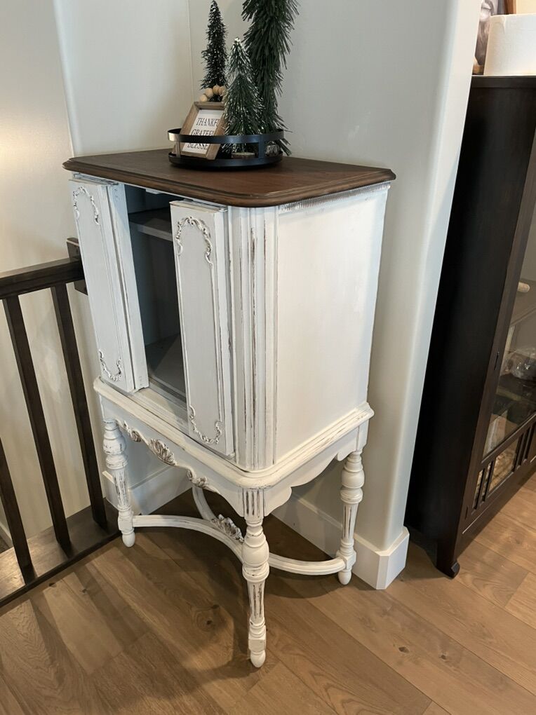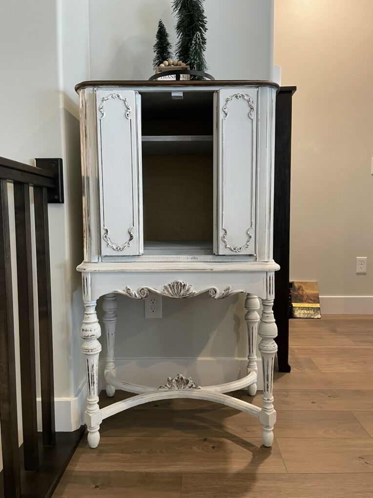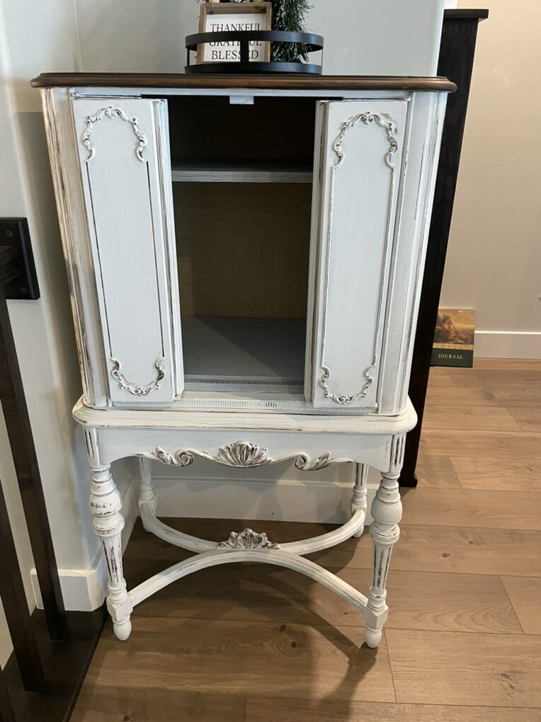 Vintage radio cabinet Gutted and ready for storage Such a hard to find piece Stained dark walnut and painted white with distressing It’s solid wood with the cutest medallion hardware $435 in Tooele