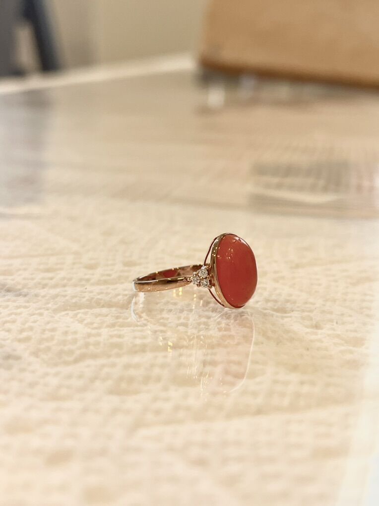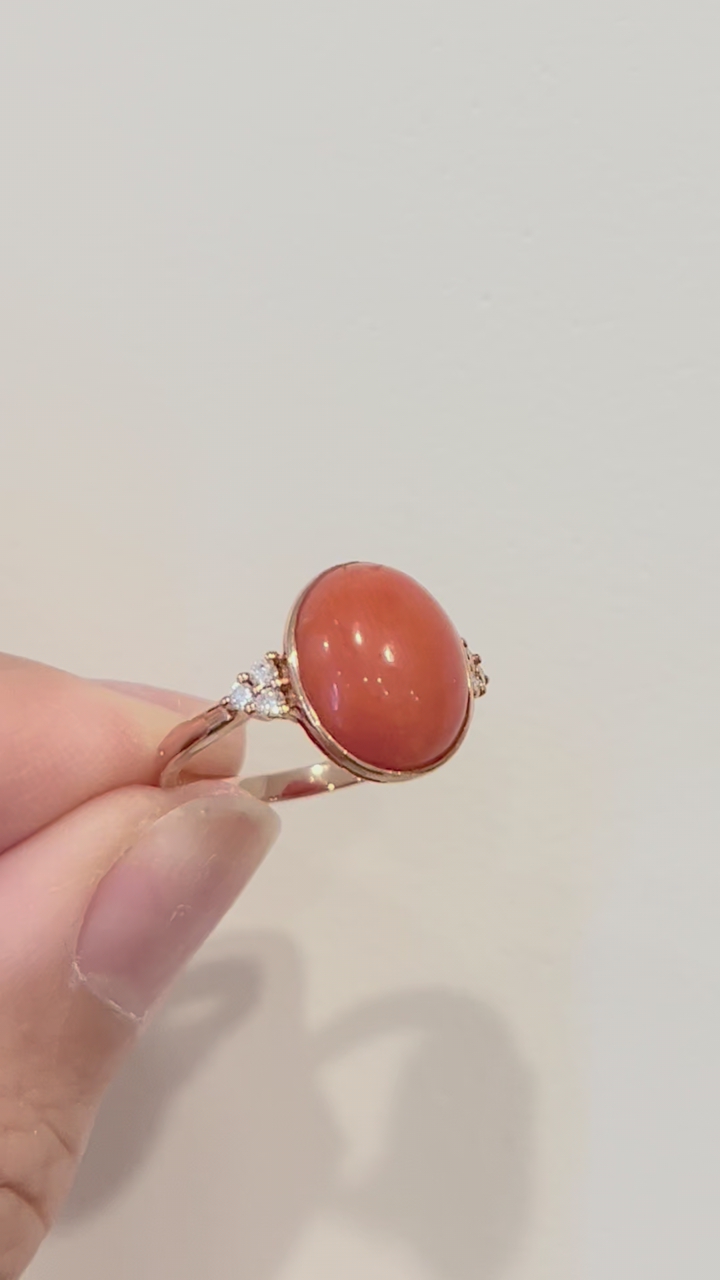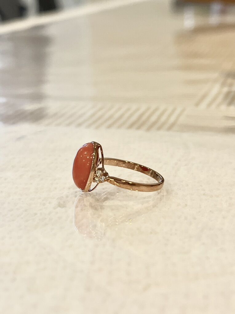 3.6 Carat Natural Coral with lab gorwn diamond on the side. 9K Rose gold setting. Size 6.