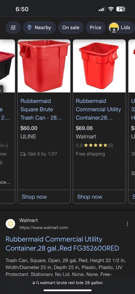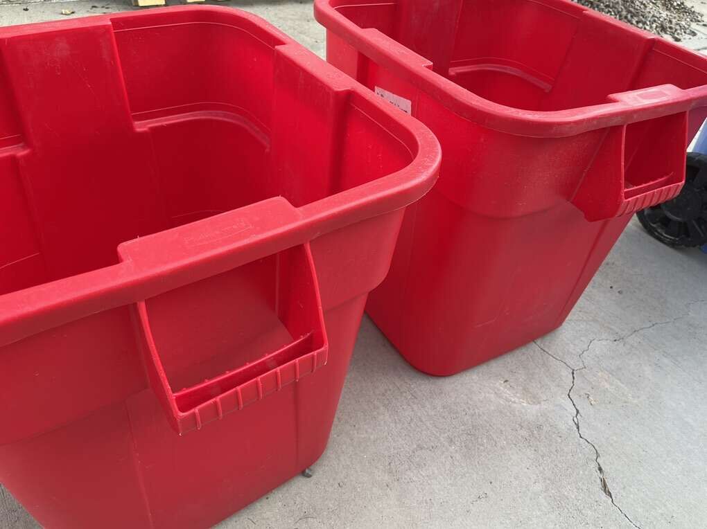 I have two of these red, square, Brute 28 gallon cans, sold separately. They don't have lids. They are sold at Walmart for $69.09 each without lids. They have handles for toting and are durable. These are from a building that closed down and didn't use them. Call or text with any questions at 801-319-5697.