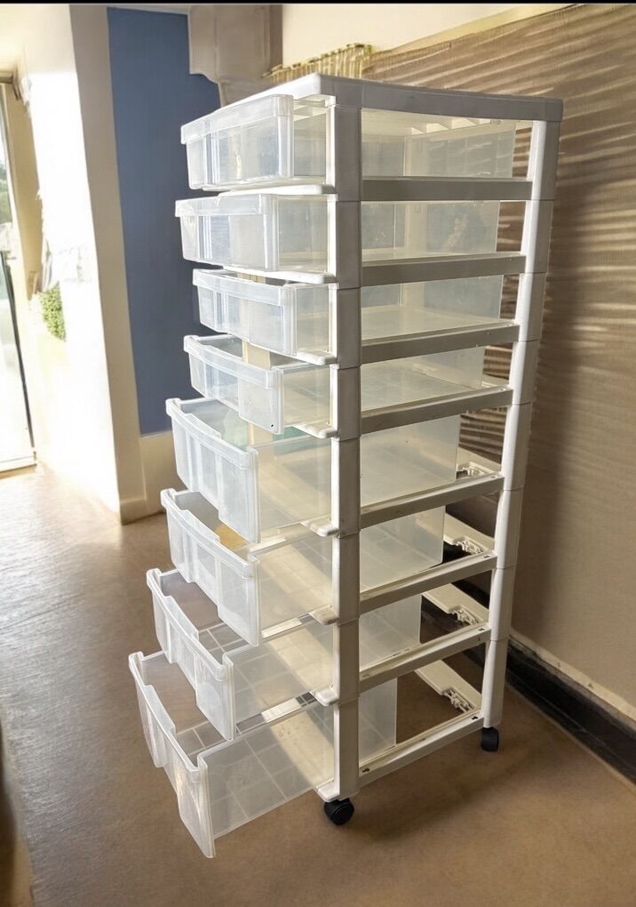 Venmo12” wide 44.5” tall 16” deep. I used the for artist paints only 1 drawer has a 1” paint stain inside. They are on wheels. Drawer on bottom 7” tall top ones 4” tall. They are clean, you will not need to wash them. No cracks or damage all drawers work perfectly