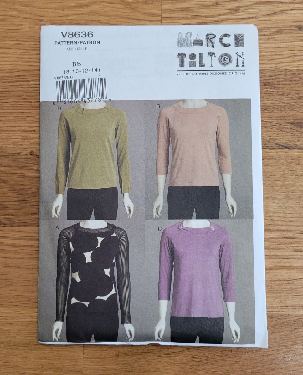 Vogue V8636 $5.00 Fitted Pullover Tops with Darted Necklines Size 8-14 for stretch knits