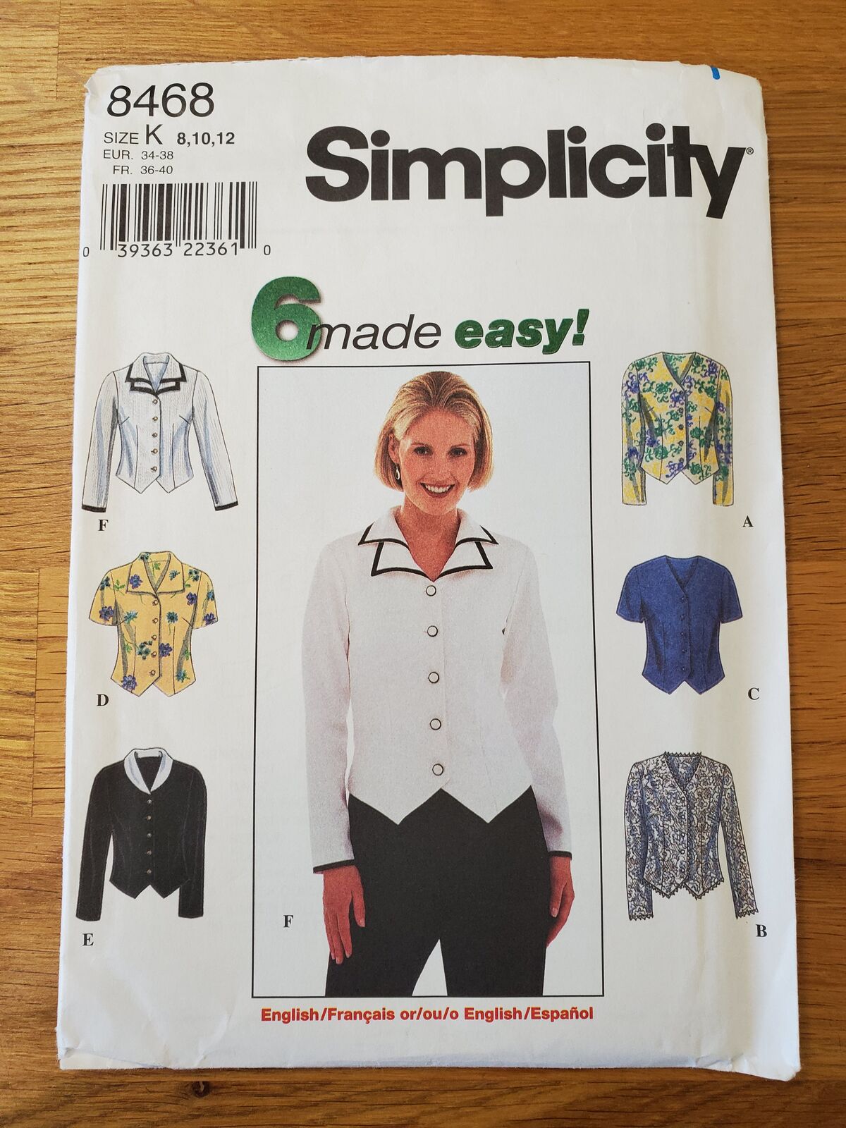 Simplicity 8468 $4.00 Semi-fitted Blouse with Collar and Sleeve Variations Size 8-12 for woven fabrics