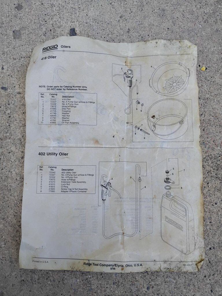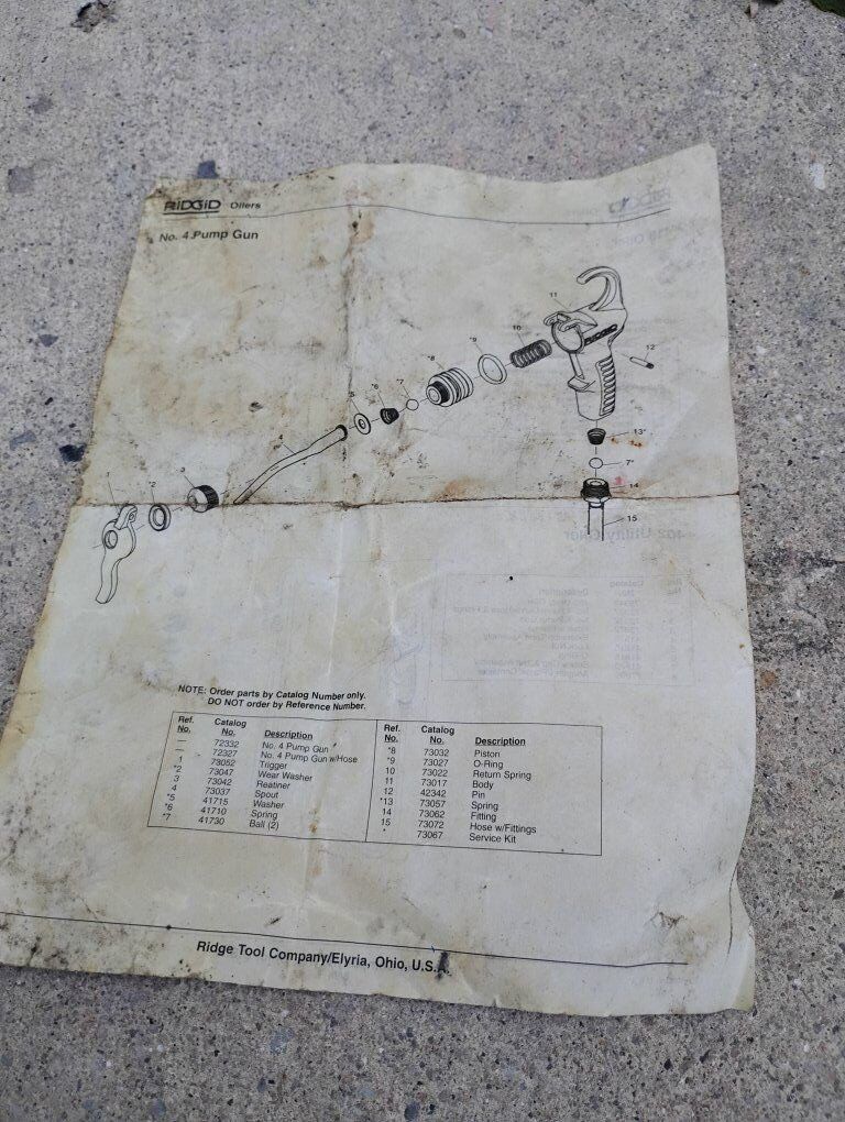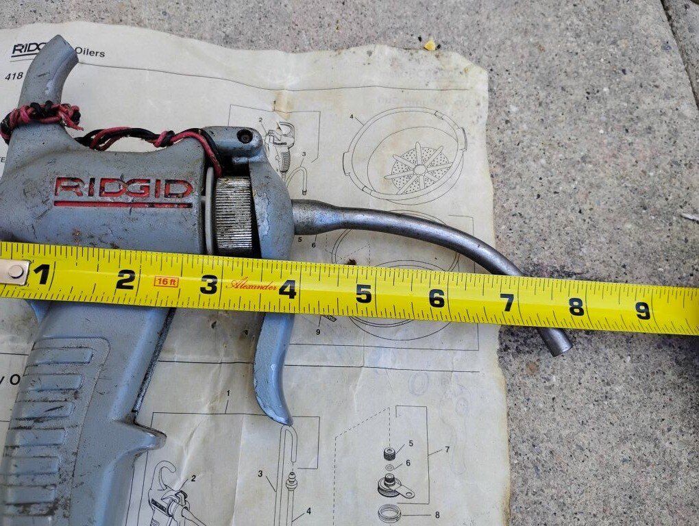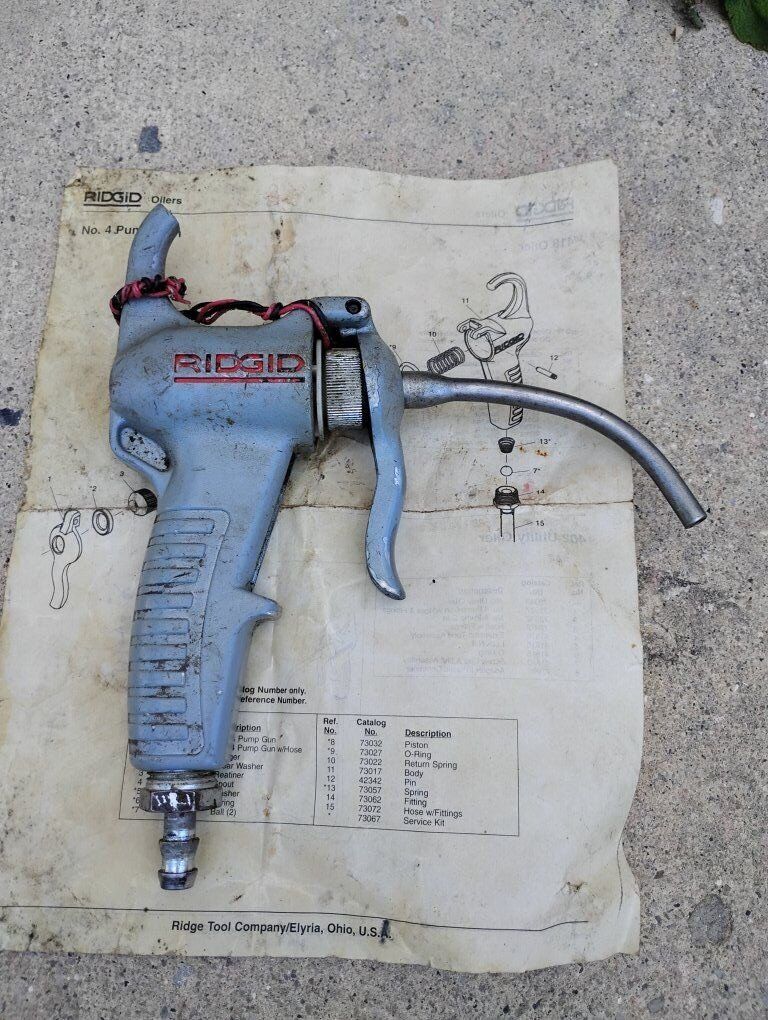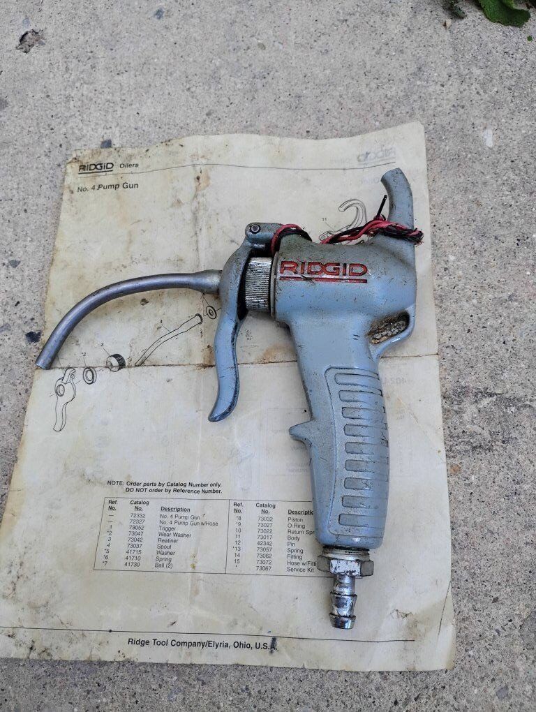 Venmo(Price reduced on 12/9) Up for sale is a Ridgid #4 Pump Gun, #418 Oiler, or #402 Utility Oiler with manual. Measuring 8.5" x 8" this Ridgid oiler is in good working condition with some wear and the top hanger hook is broken, see in pictures.
