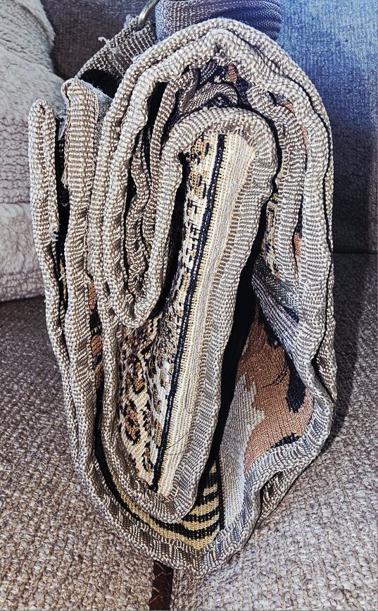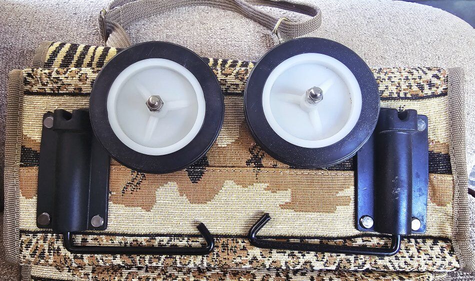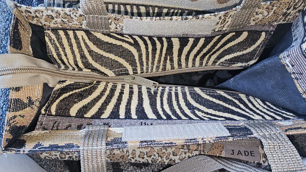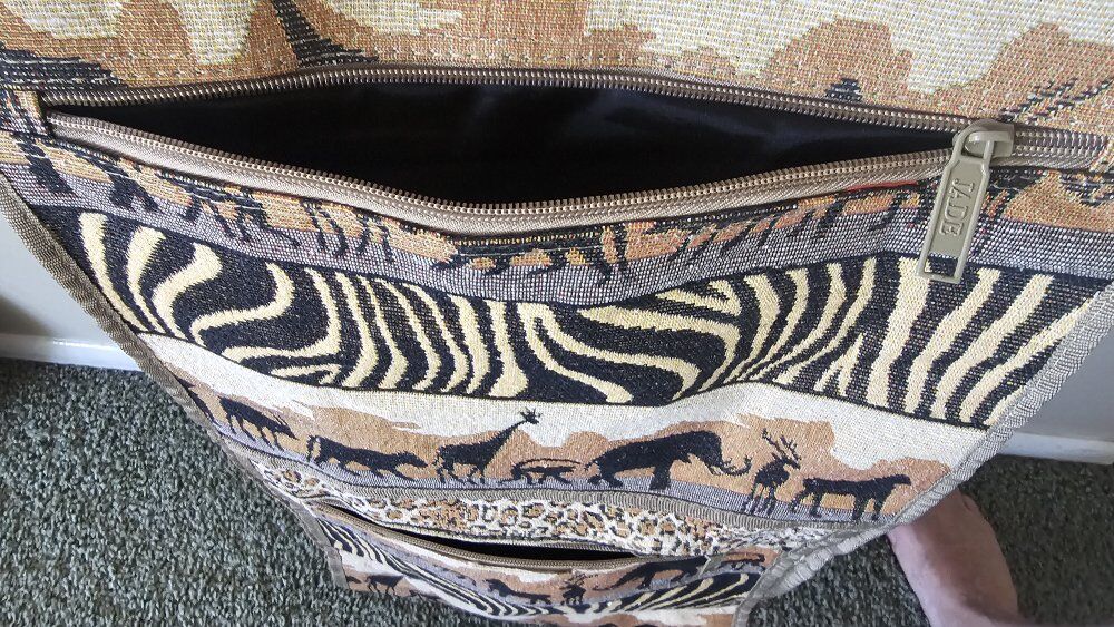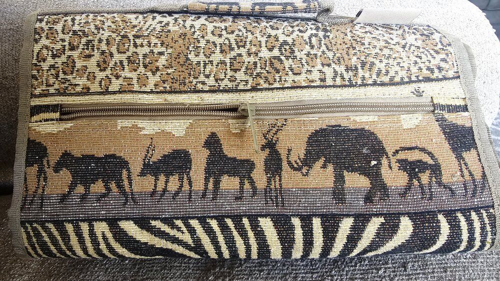 JADE African Safari TAPESTRY carrier/suitcase. 23" X 13" Features foldable wheels, THREE outside zipper compartments, ADJUSTABLE handle straps, and INSIDE zipper. Would be suitable used as a carry-on OR perfect for a day shopping trip. Wheels are collapsible and the entire bag is COMPACT and folds down for easy, limited storage spaces. (see pictures). (12" X 7") In like new condition!!