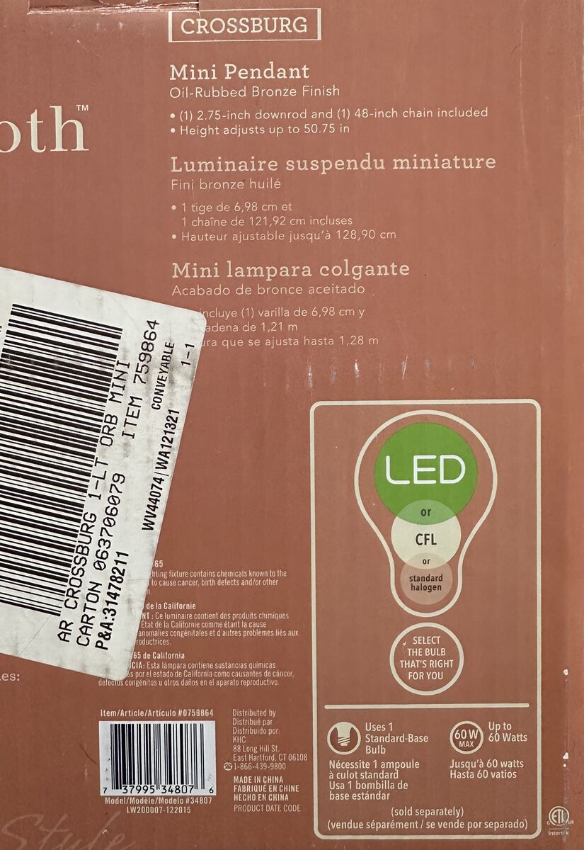 VenmoOil-rubbed bronze pendant light. Brand new, never been mounted. I moved before I ever got around to mounting it, and it's not needed now. Asking $20.00 obo