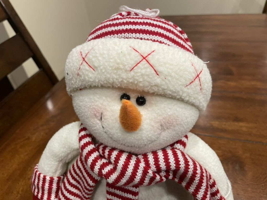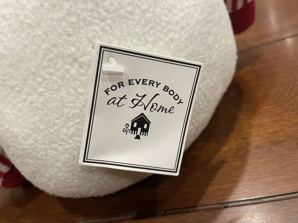 I have a soft plush snowman that feels like fleece. He has really long legs for sitting on a shelf or mantle. He still has a tab on his back that says For Every Body at Home. He is about 25 inches long. See my other ads for jewelry, artwork, home decor and more.