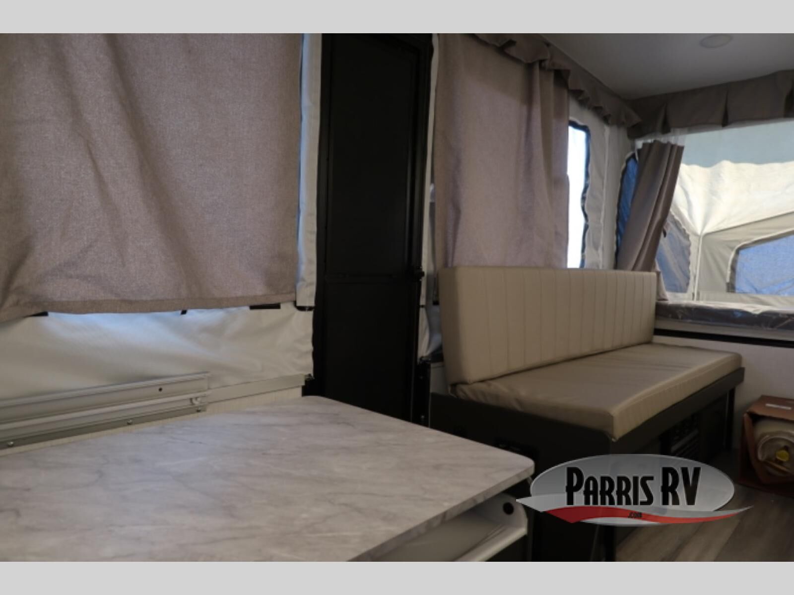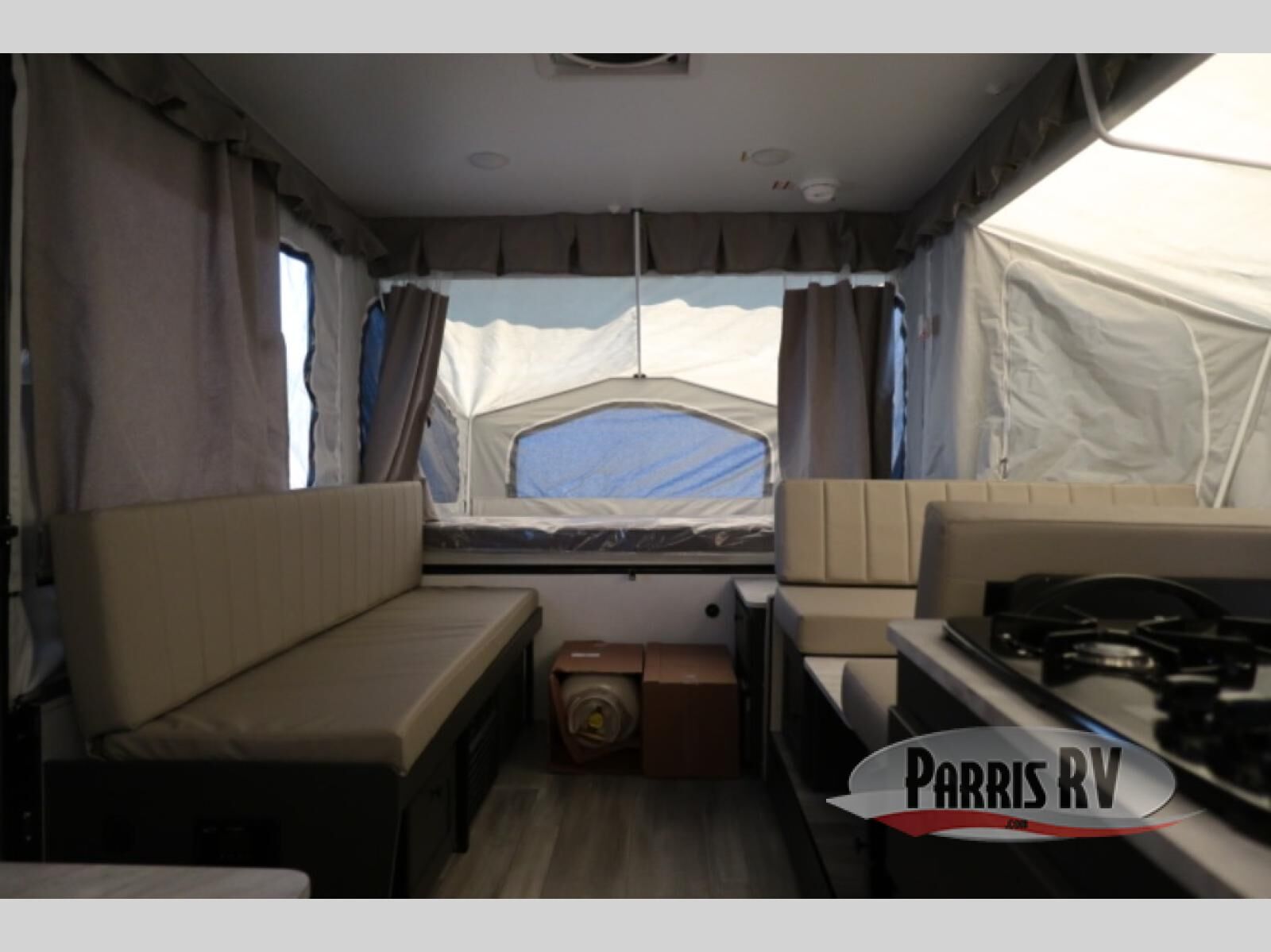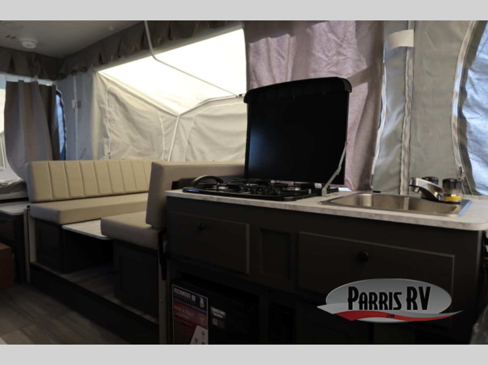 You won't have to worry about length restrictions or cumbersome towing because this Rockwood Freedom Series folding pop-up camper provides you with a lightweight and flexible alternative to heavy RVs! This camper has a single slide built into it which will deliver extra space to the interior without adding to the overall width while traveling, and the booth dinette is a functional piece of furniture that can serve as a dining table and a bed. The swing galley includes a three burner range with a cover to cook meals and a sink for easy cleaning. There is also a shower/toilet to make this unit even more convenient.