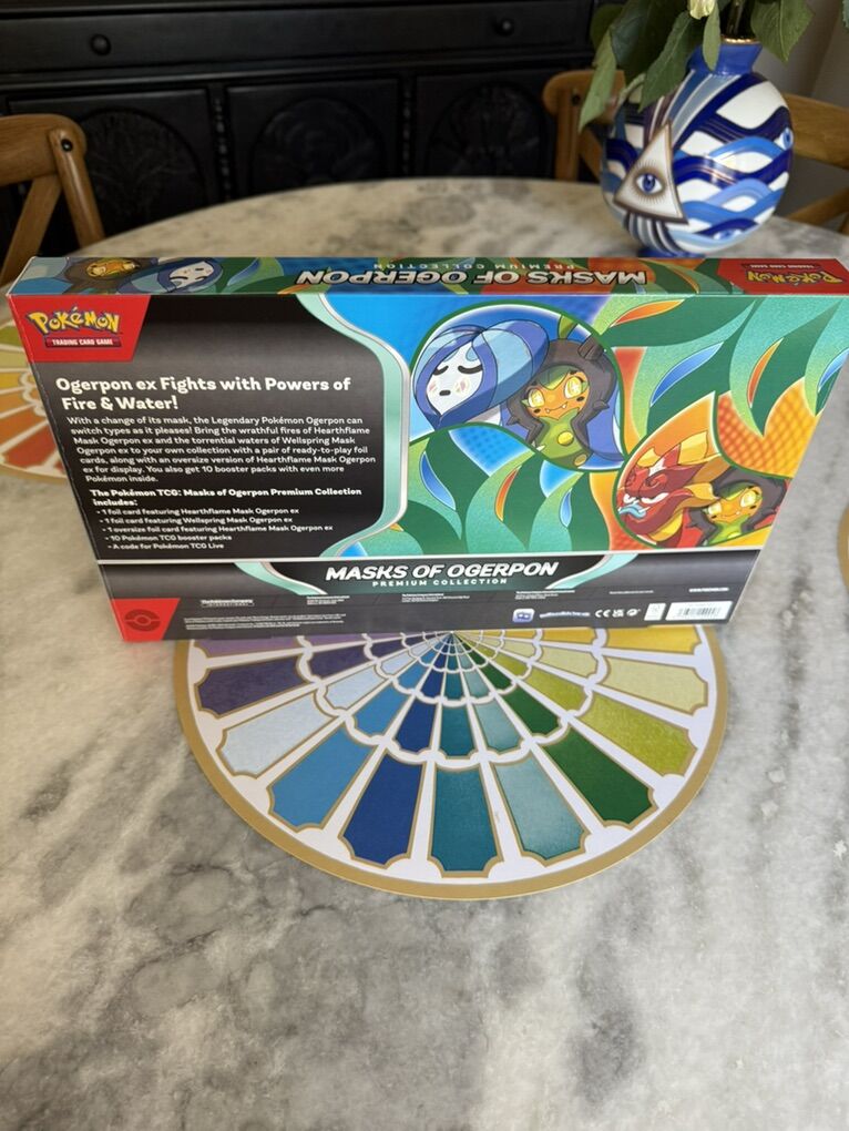 The Pokémon TCG: Masks of Ogerpon Premium Collection includes: • 1 foil card featuring Hearthflame Mask Ogerpon ex • 1 foil card featuring Wellspring Mask Ogerpon ex • 1 oversize foil card featuring Hearthflame Mask Ogerpon ex • 10 Pokémon TCG booster packs • A code for Pokémon TCG Live