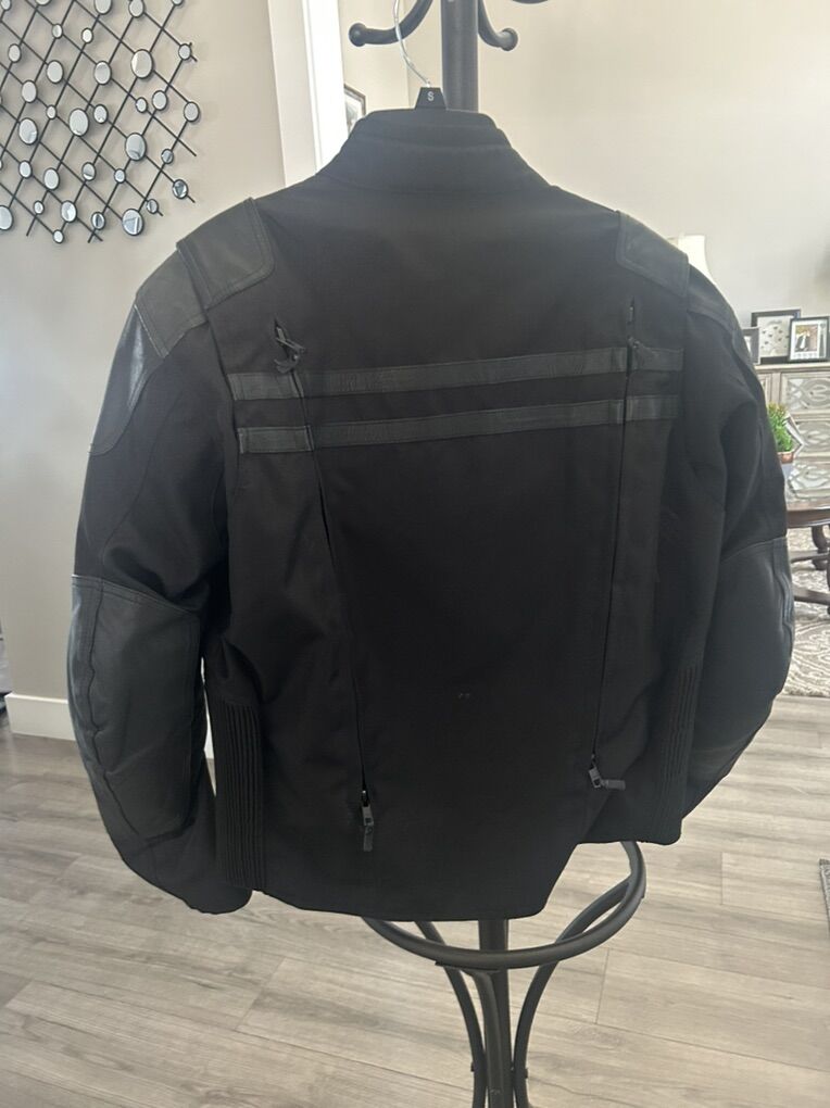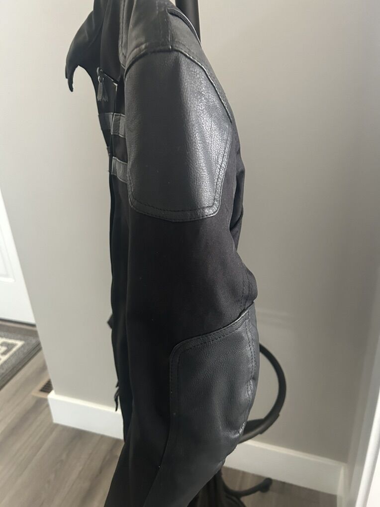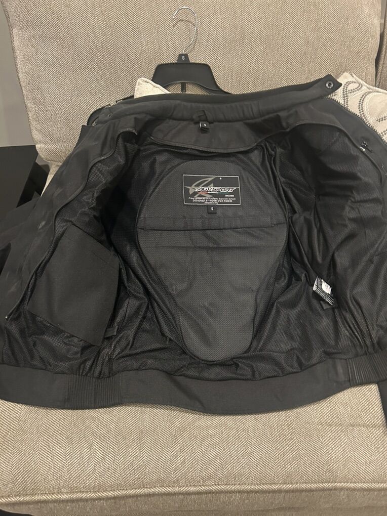 VenmoMotorcycle jacket, like new, only used about twice, size small, black, and has protectors on the shoulders, elbows, and back.
