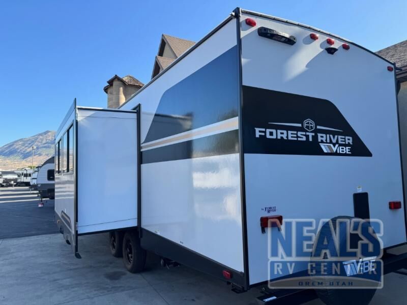 With any Vibe travel trailer by Forest River, you will enjoy comfort at every turn! There is a Norco huck-bolted steel frame, an enclosed underbelly with 12V heating pads, and a PVC roof membrane for added durability. You will also find a universal docking station outside, along with slam latch doors, European style square windows, and an automotive painted front cap. Head inside to enjoy the premium residential-style furniture, decorative window treatments, privacy shades in the living room and bedroom, and many more comforts!