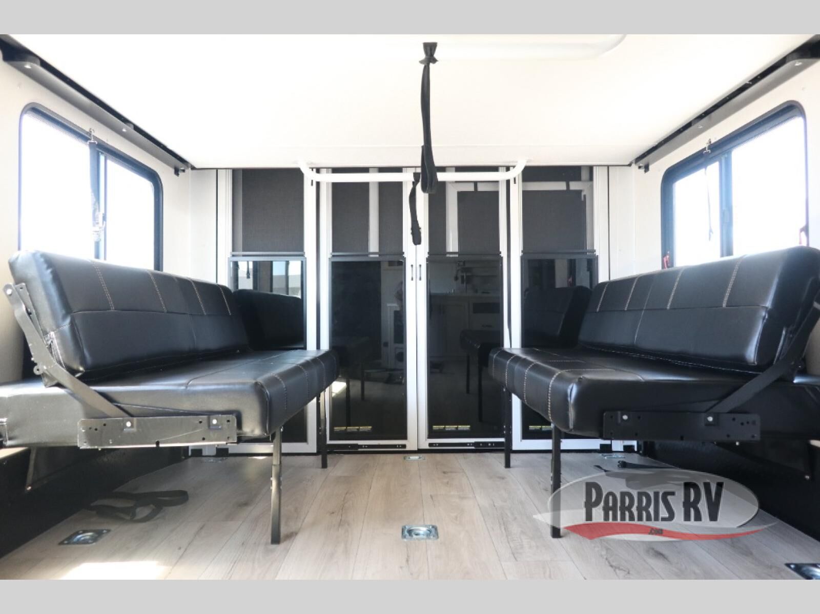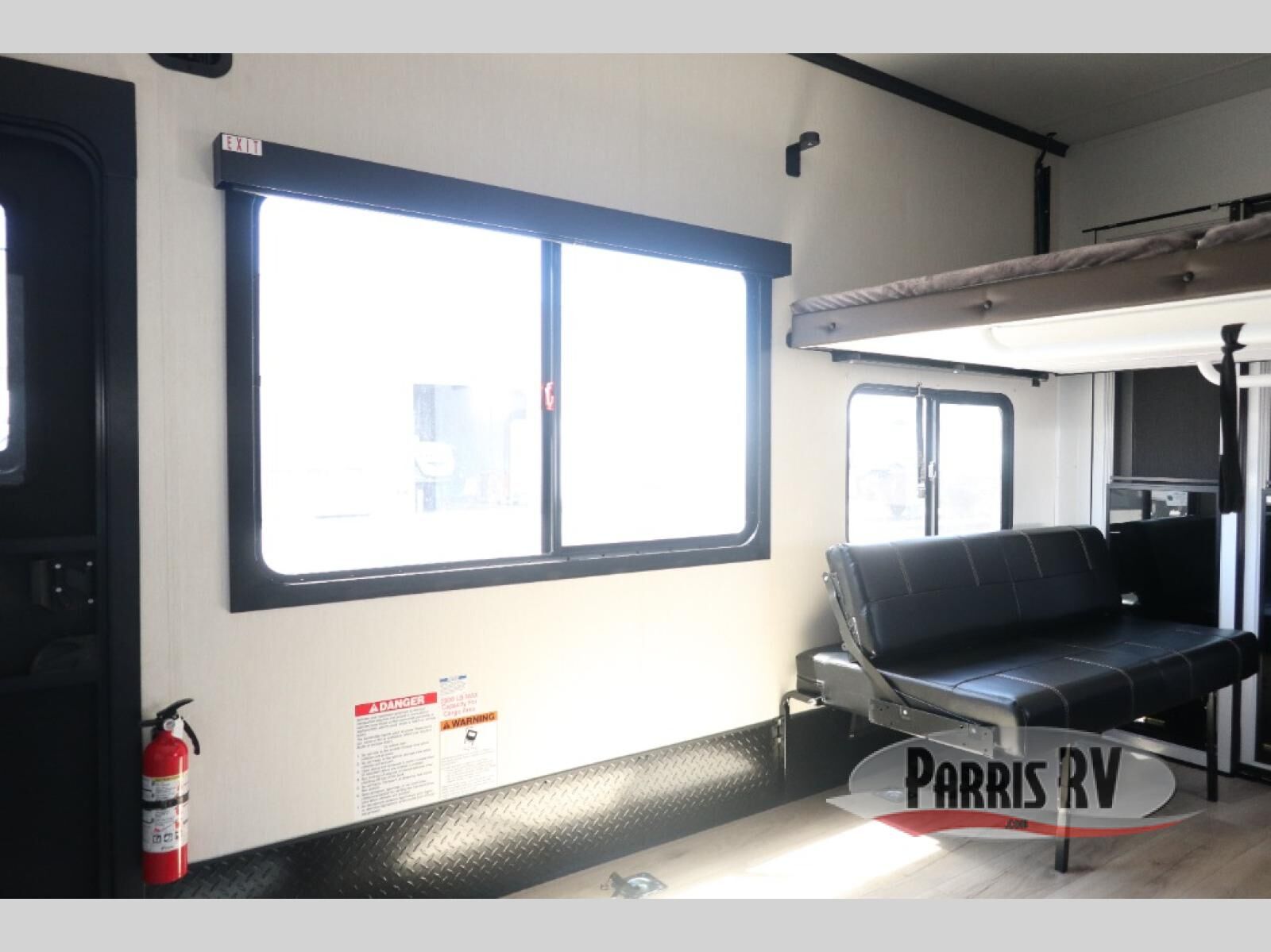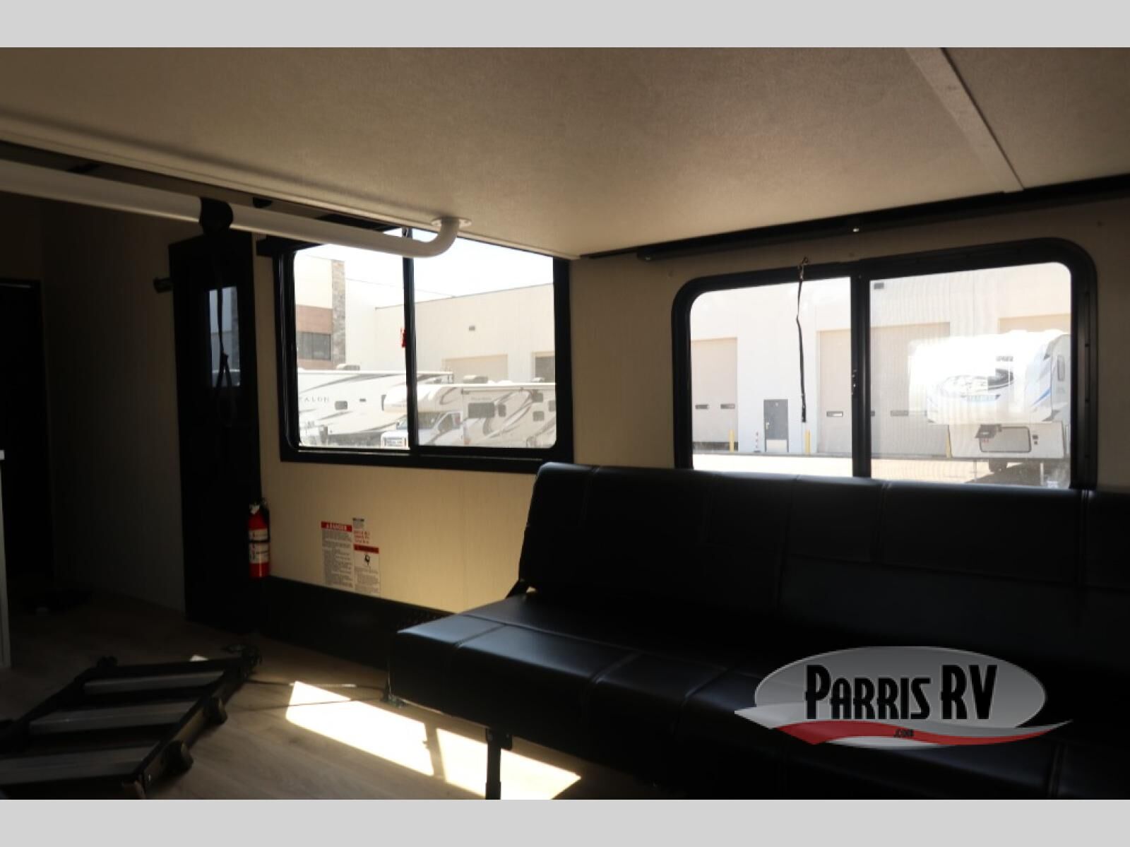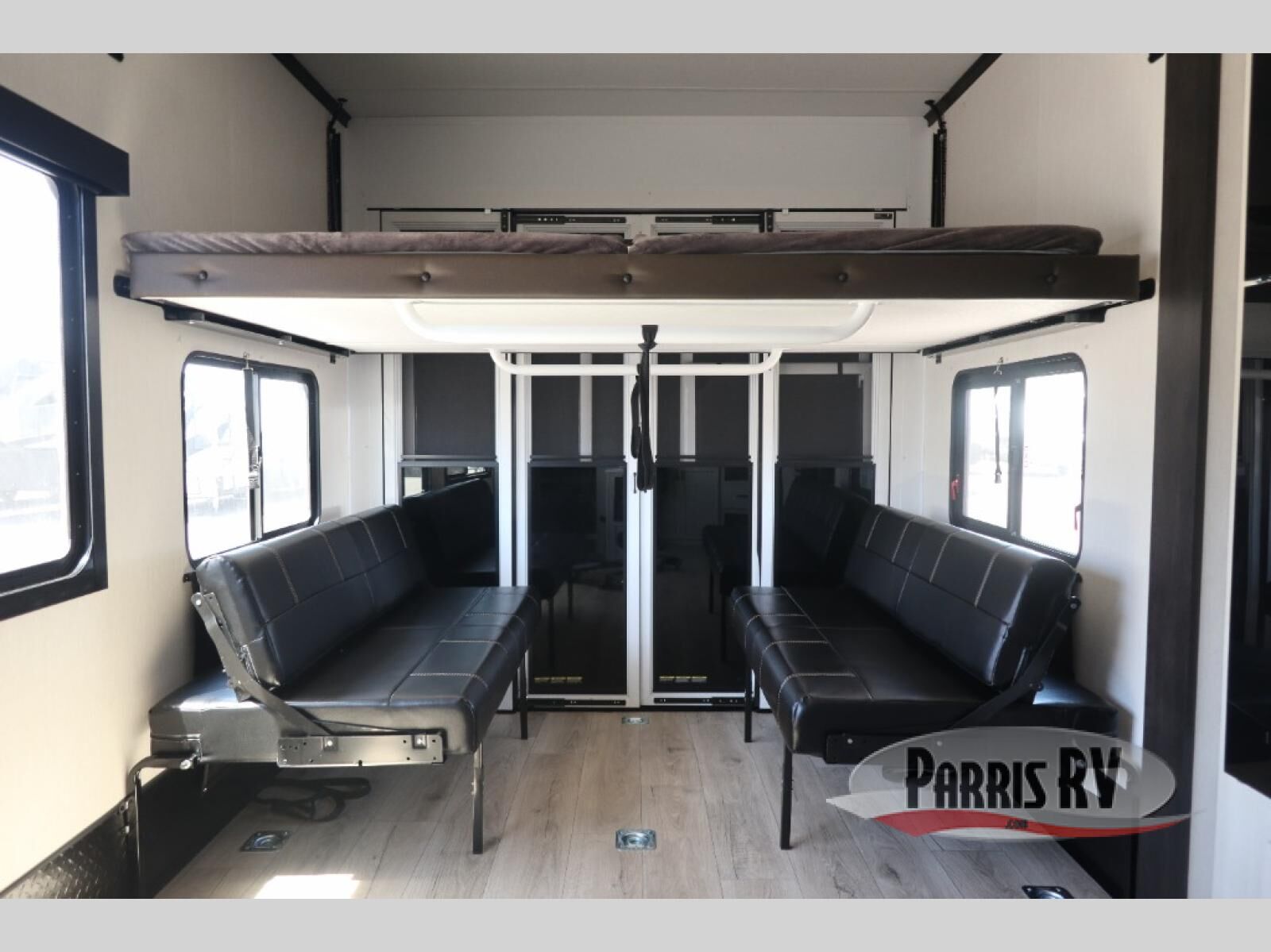 This double slide out toy hauler is ready for adventure when you are! Once your toys are unloaded using the ramp door, you can set up the flip-up sofas or set up the drop-down queen bed for guests to sleep on. You'll enjoy the front private bedroom all to yourselves that includes a king bed slide and a large dresser to keep your things organized. A three-burner range and 30" microwave will let you make meals each day, and the 10.7 cu. ft. 12V refrigerator will keep your food stored away.