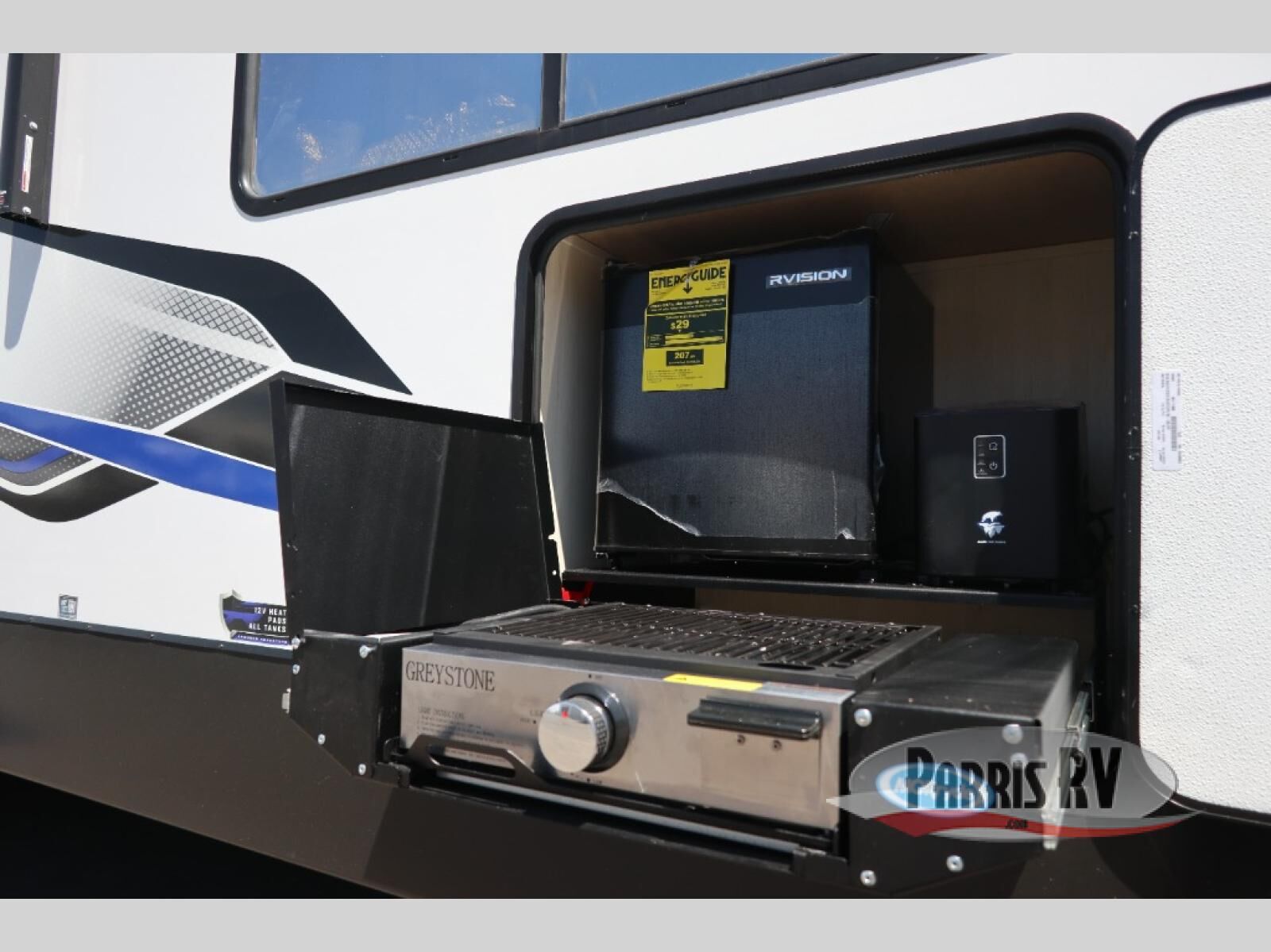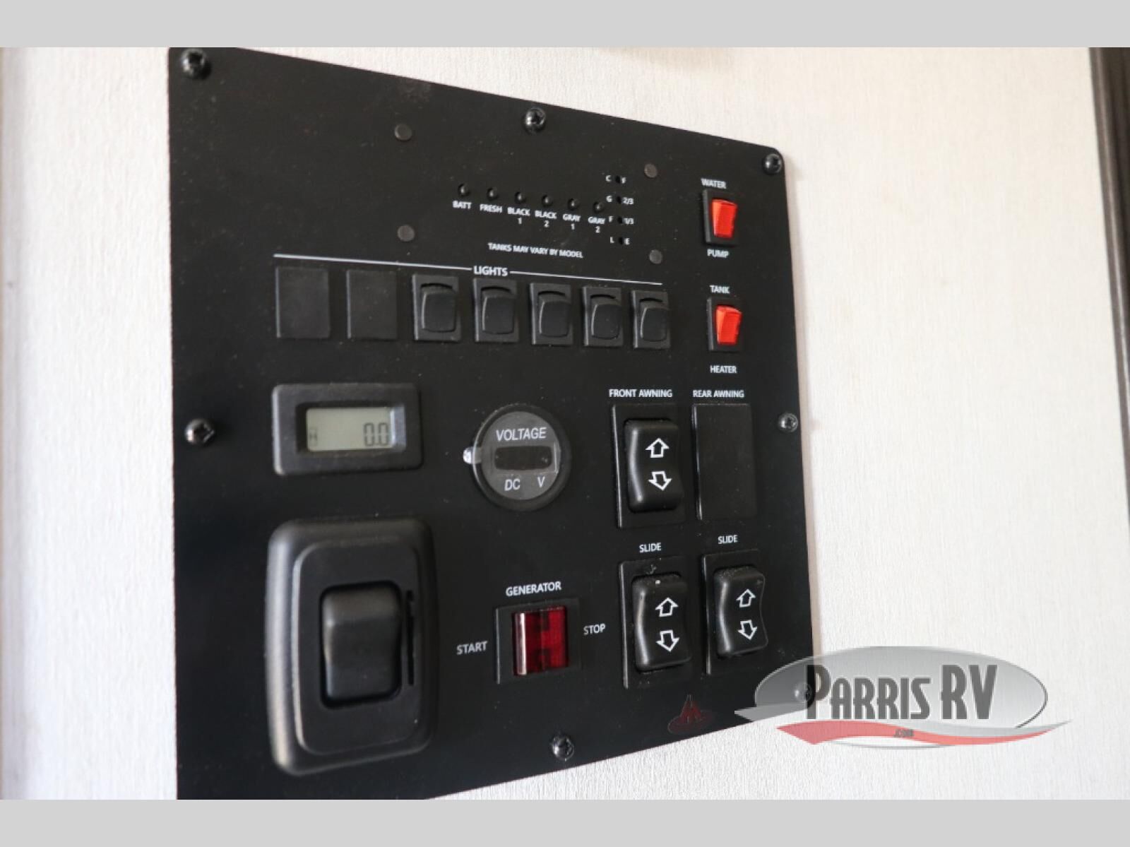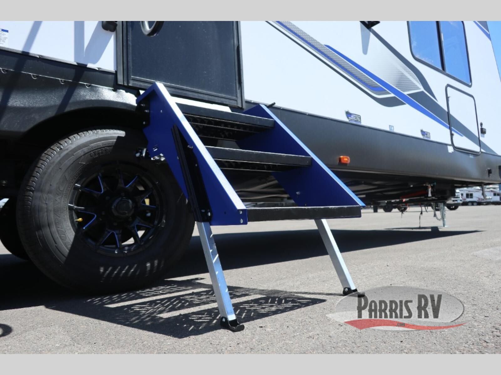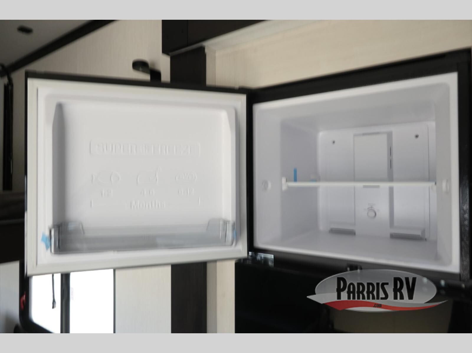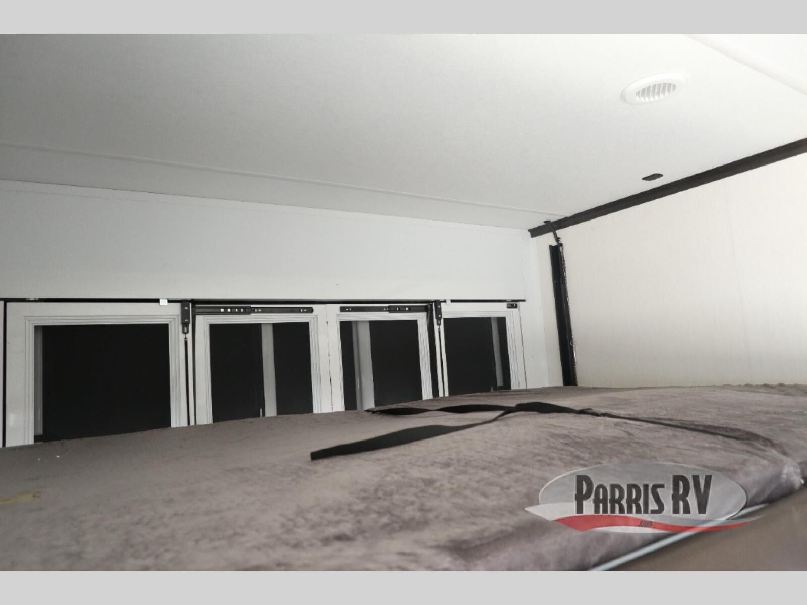 This double slide out toy hauler is ready for adventure when you are! Once your toys are unloaded using the ramp door, you can set up the flip-up sofas or set up the drop-down queen bed for guests to sleep on. You'll enjoy the front private bedroom all to yourselves that includes a king bed slide and a large dresser to keep your things organized. A three-burner range and 30" microwave will let you make meals each day, and the 10.7 cu. ft. 12V refrigerator will keep your food stored away.