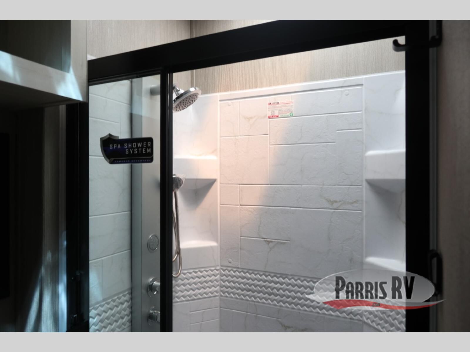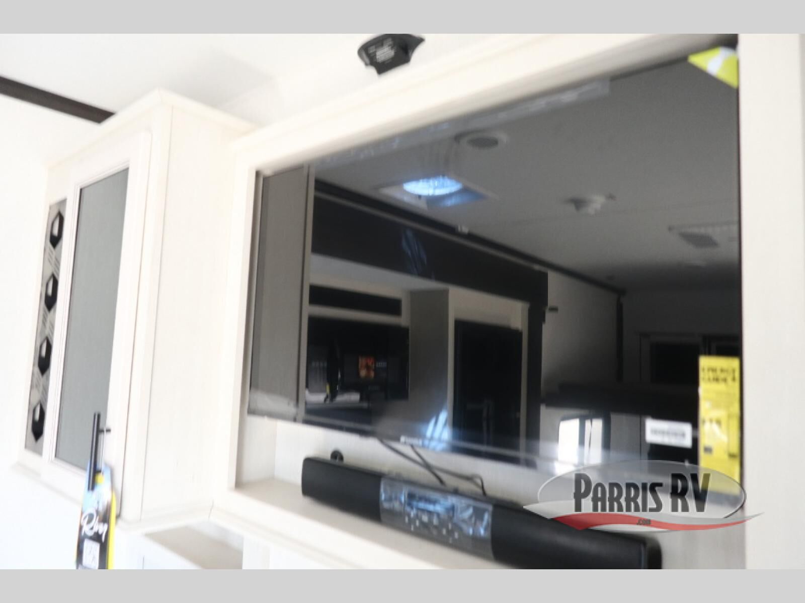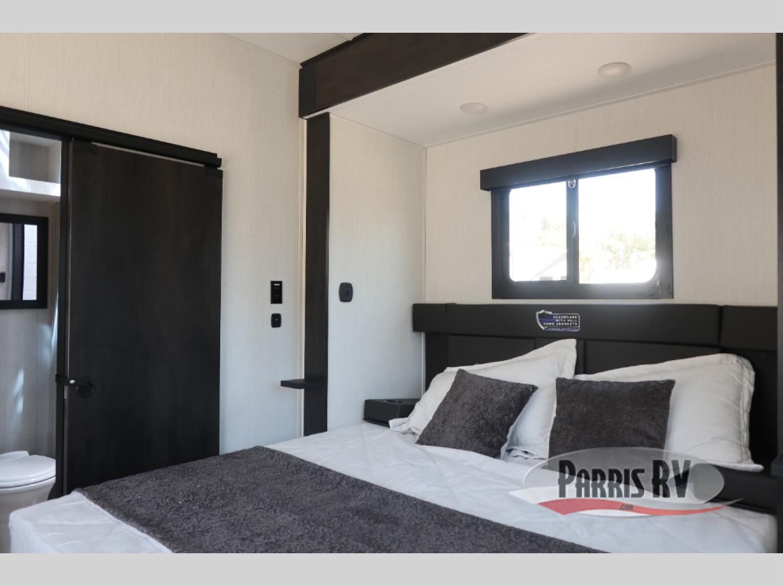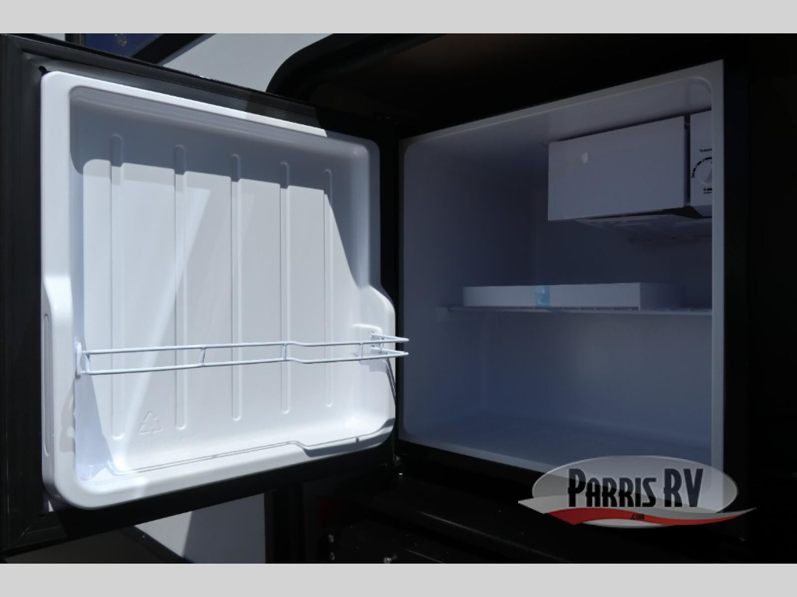 This double slide out toy hauler is ready for adventure when you are! Once your toys are unloaded using the ramp door, you can set up the flip-up sofas or set up the drop-down queen bed for guests to sleep on. You'll enjoy the front private bedroom all to yourselves that includes a king bed slide and a large dresser to keep your things organized. A three-burner range and 30" microwave will let you make meals each day, and the 10.7 cu. ft. 12V refrigerator will keep your food stored away.