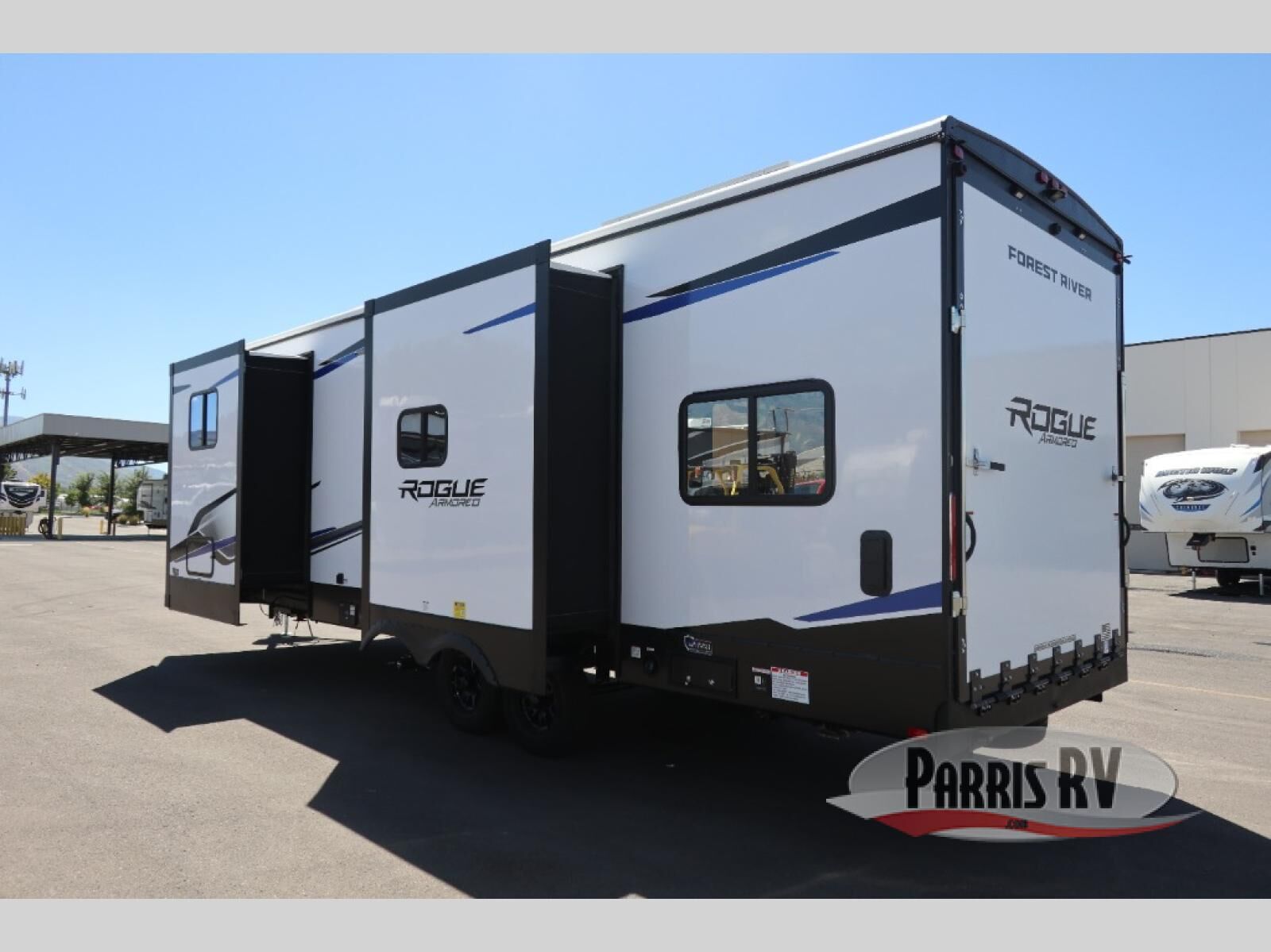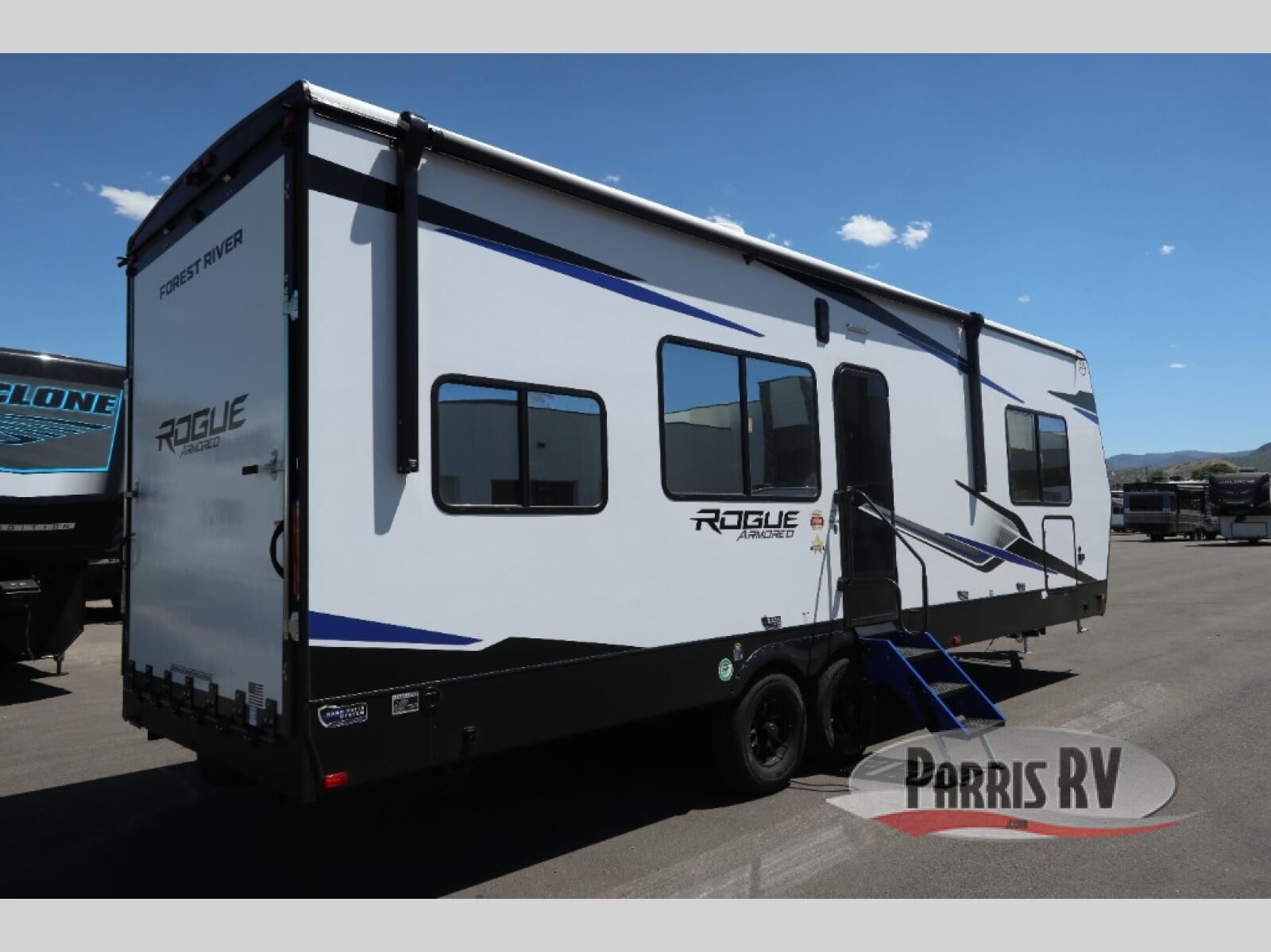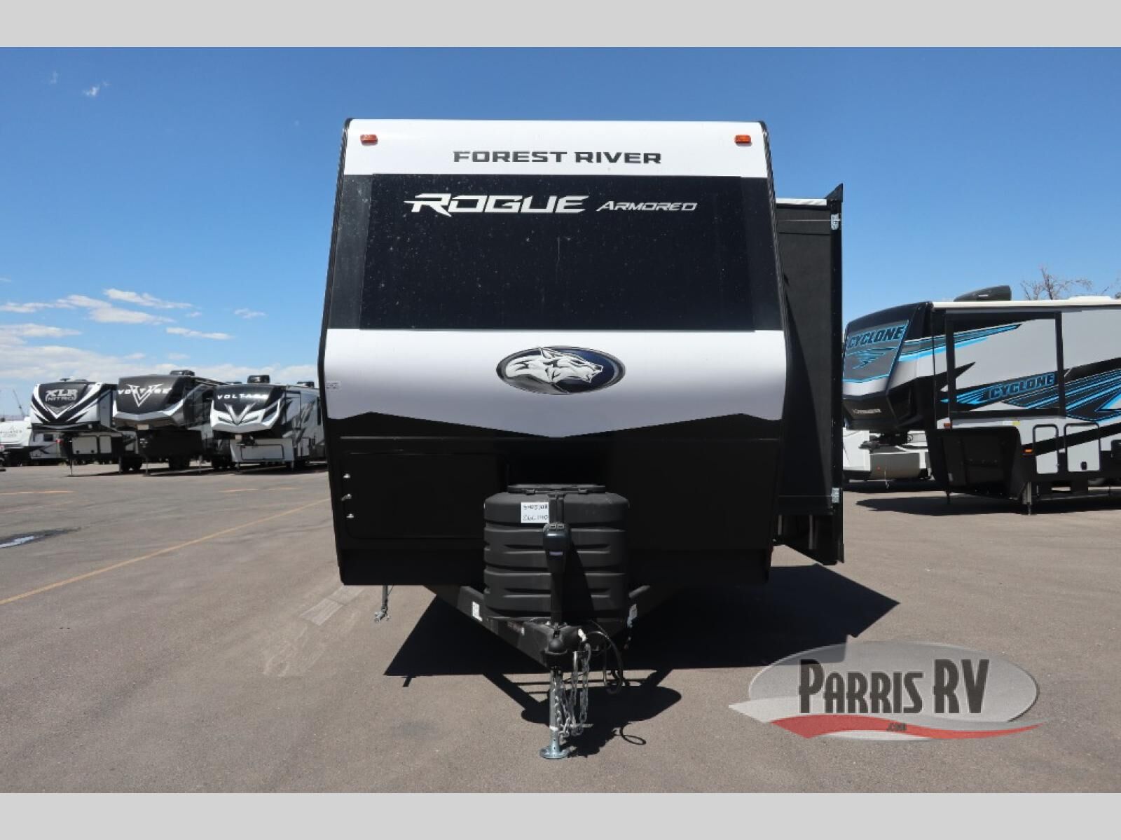 Every one of these Forest River Cherokee Rogue Armored travel trailer toy haulers come with the features you want most at an affordable price tag! The DuraPoxy gas/oil resistant floor has 5,000 lb. tie downs to ensure your toys will arrive safely without damaging the flooring, plus the 3,000 lb. rated ramp door makes it easy to load them. A 15,000 BTU A/C will keep you cool even on the hottest summer days, and there are heated enclosed holding tanks with 12V heat pads on every tank for added protection. Each model includes a fuel station with a digital readout, a ramp door patio system, a tire pressure monitoring system, and many more stand-out features. Inside, you'll find zebra shades in the living room, multiple USB charging stations, a multi-functional kitchen sink, glass shower doors, and many more comforts!