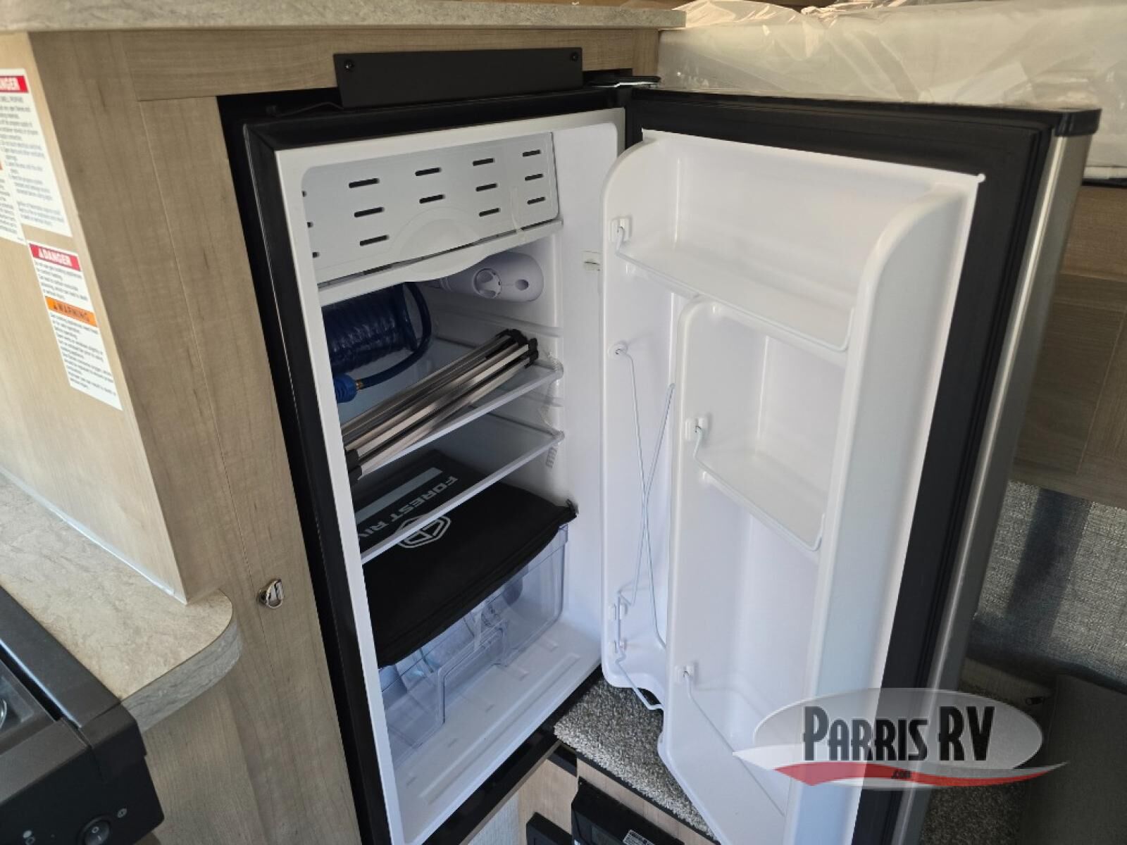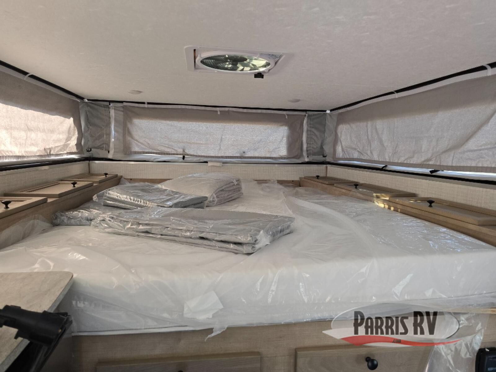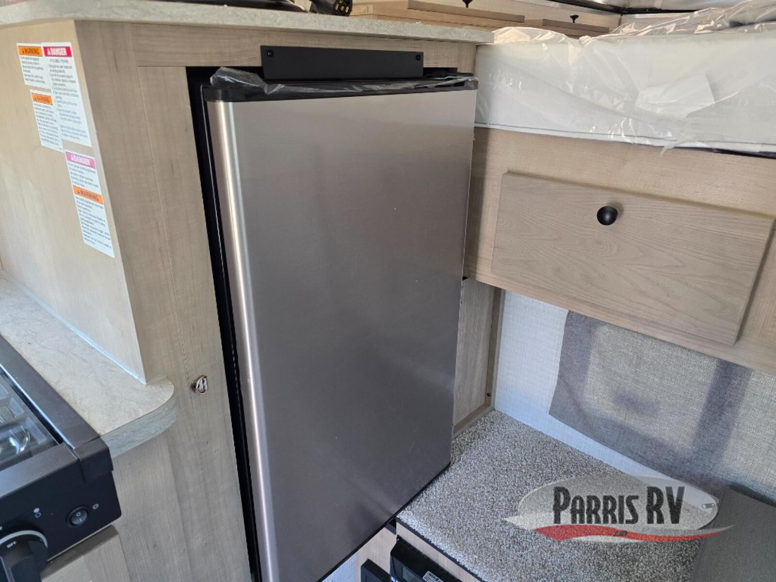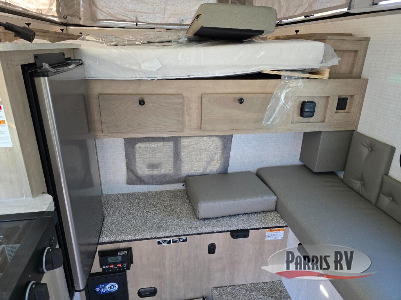 An electric roof lift with a remote will make setting up this soft side truck camper easy! Lay your head at night on the front queen bed with foot lockers and bedroom storage on either side of it to keep your items out of the way. Prepare your best meals with the two burner cooktop, store your canned goods in the pantry, and keep your beverages cold in the three way-refrigerator. The seating area comes with a table so you can enjoy your meals comfortably. There is also a wardrobe behind the private toilet for you to store your toiletries.