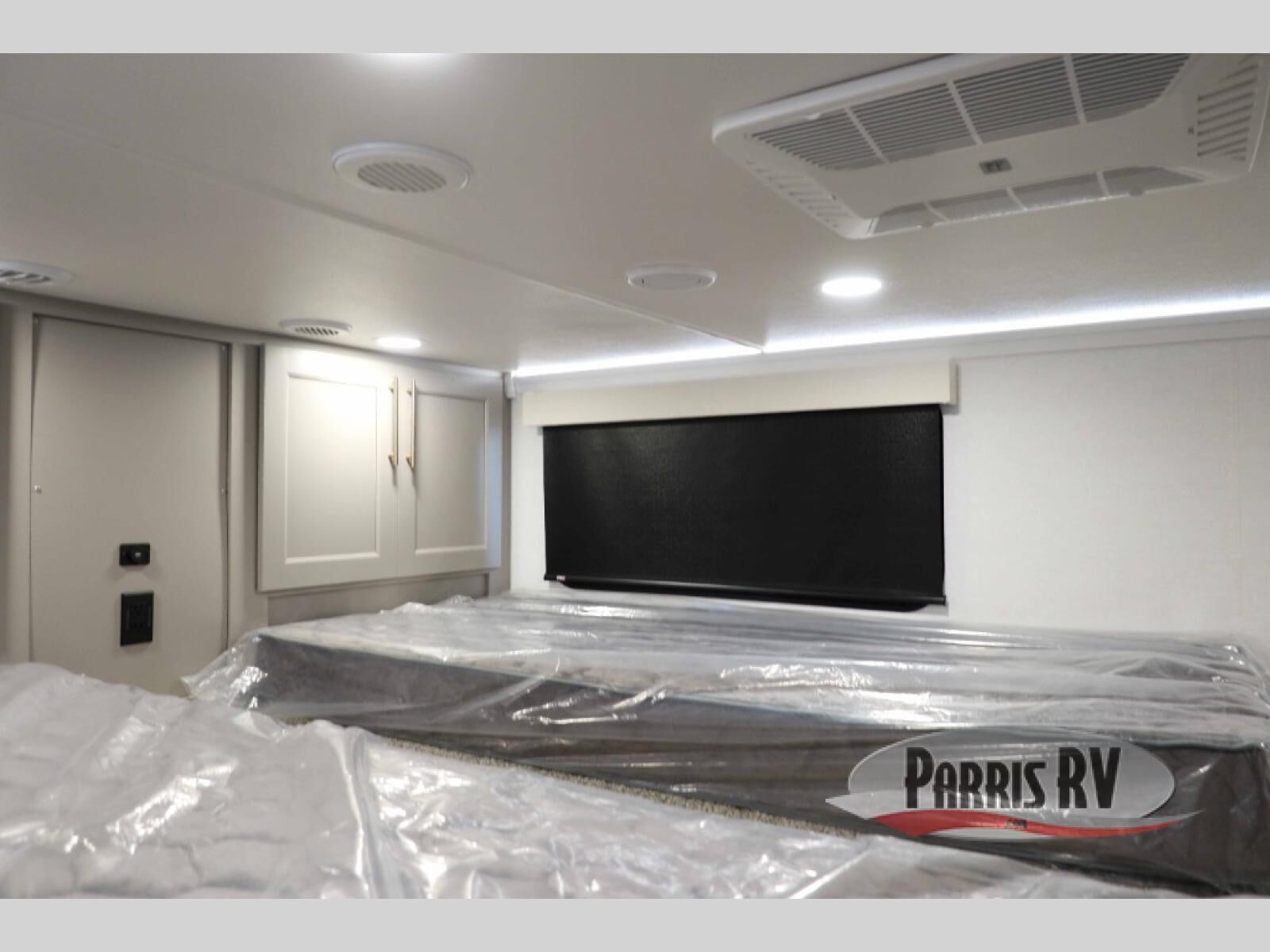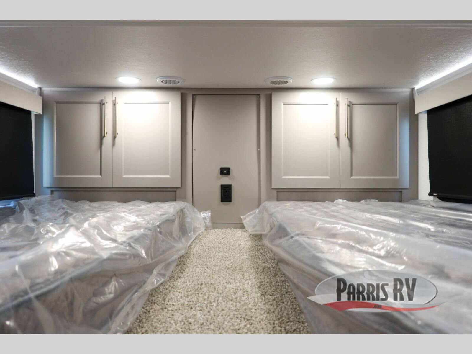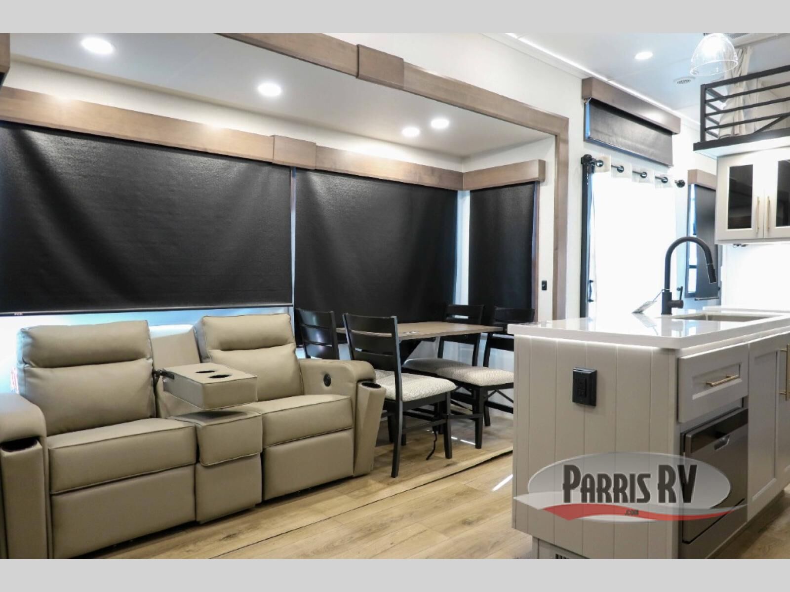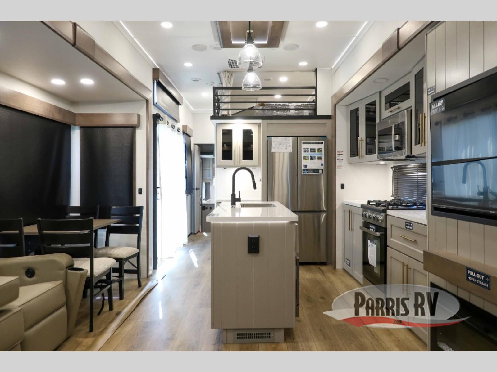 This destination trailer with a loft will be a favorite with the little ones! They will have three bunk mats to choose from plus wardrobes to keep their things picked up. You can take the rear private bedroom that includes a power tilting king bed that will allow you to sit up in bed at night to read. There is also a wardrobe, a dresser with a 32" TV, and a stackable washer and dryer to make laundry day easier than ever. A full bath with a 48" x 30" shower will let you freshen up each day, and there is a linen closet to keep clean towels close by. Everyone will enjoy spending time together in the front living area that includes a two dual recliner theater seats, a 50" TV and fireplace, and hidden storage for games or books. The chef of your group can make meals each day on the residential range and microwave, and there is a 110V Samsung refrigerator to keep your food fresh.