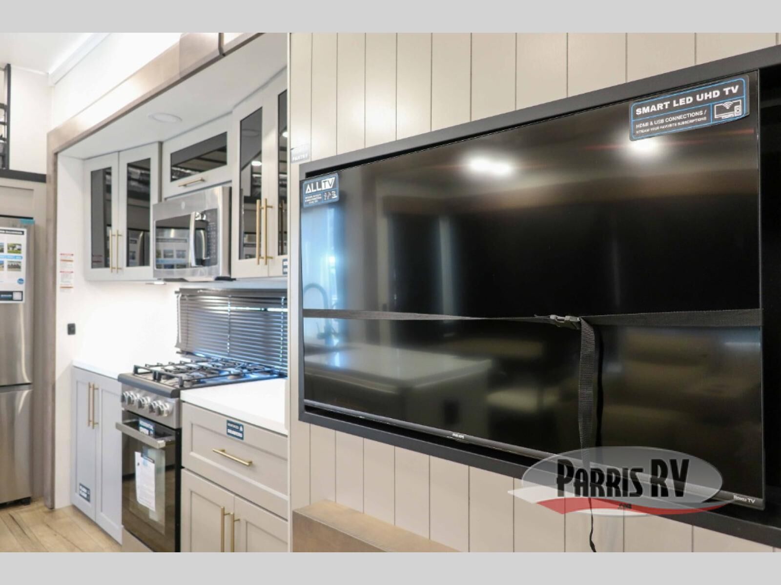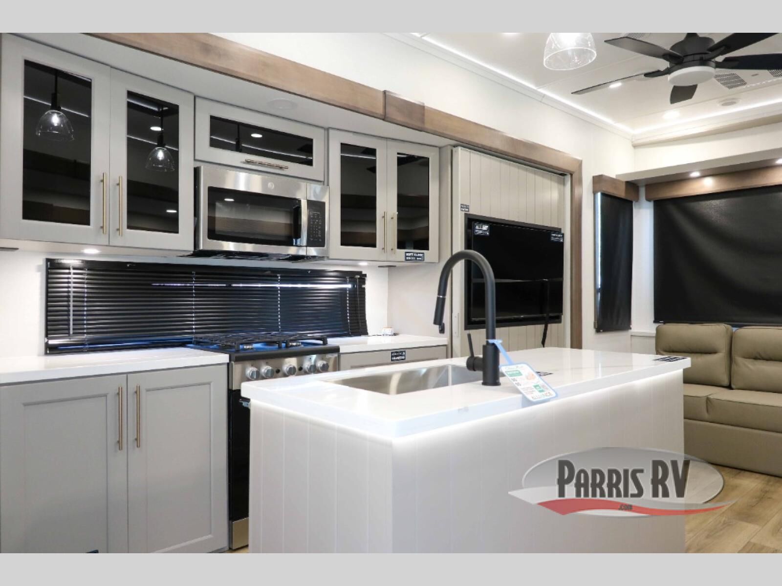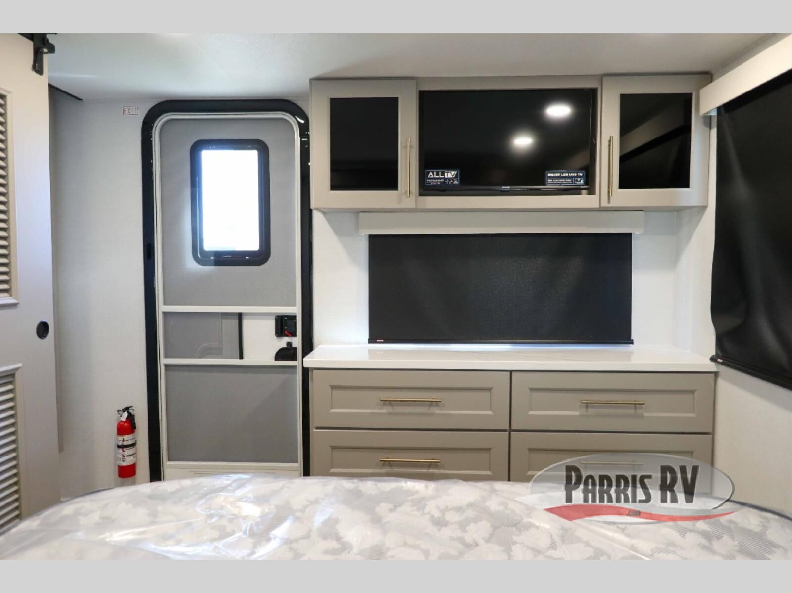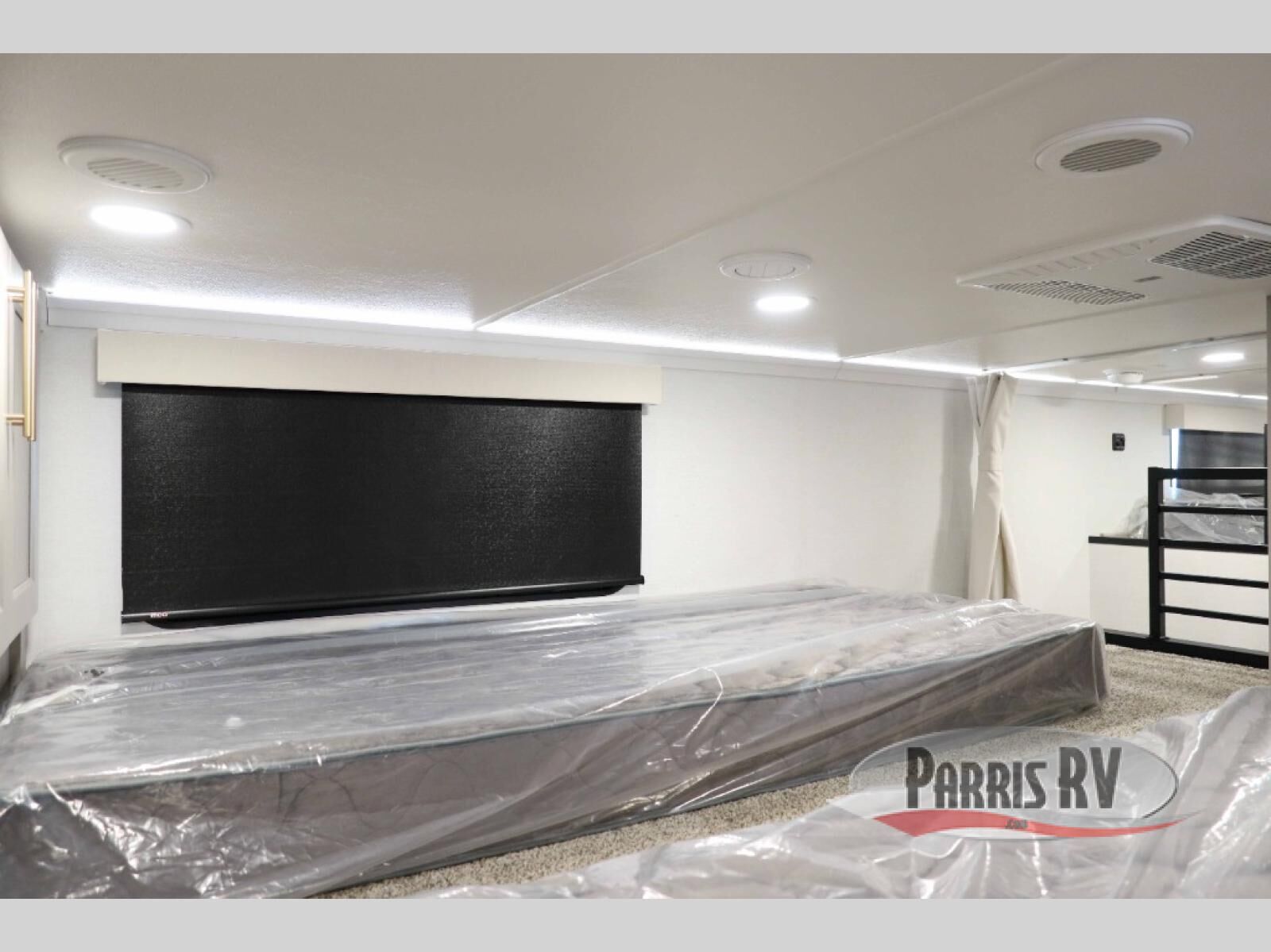 This destination trailer with a loft will be a favorite with the little ones! They will have three bunk mats to choose from plus wardrobes to keep their things picked up. You can take the rear private bedroom that includes a power tilting king bed that will allow you to sit up in bed at night to read. There is also a wardrobe, a dresser with a 32" TV, and a stackable washer and dryer to make laundry day easier than ever. A full bath with a 48" x 30" shower will let you freshen up each day, and there is a linen closet to keep clean towels close by. Everyone will enjoy spending time together in the front living area that includes a two dual recliner theater seats, a 50" TV and fireplace, and hidden storage for games or books. The chef of your group can make meals each day on the residential range and microwave, and there is a 110V Samsung refrigerator to keep your food fresh.