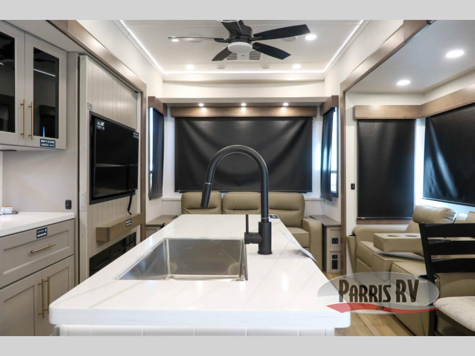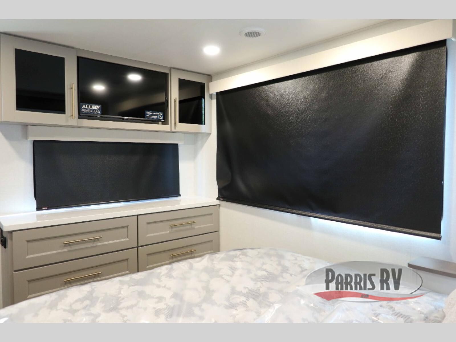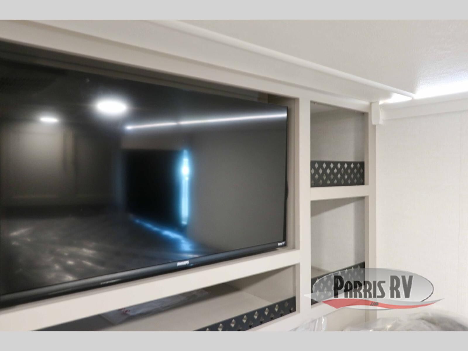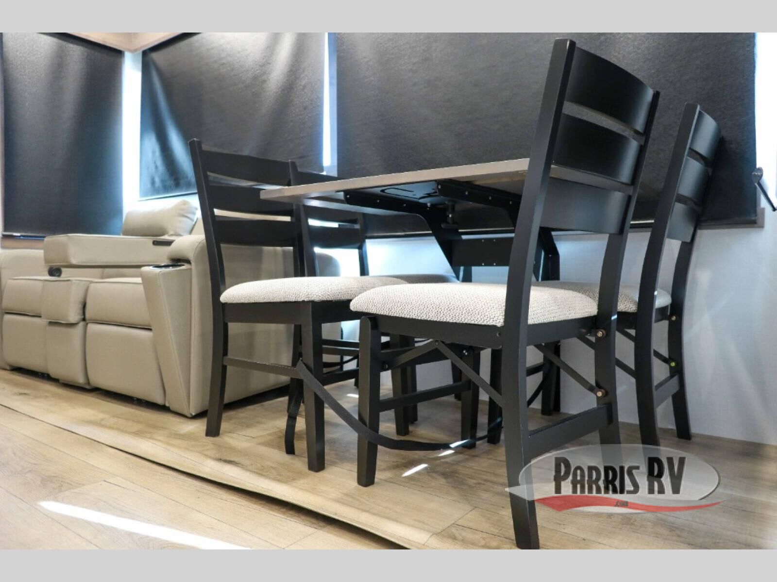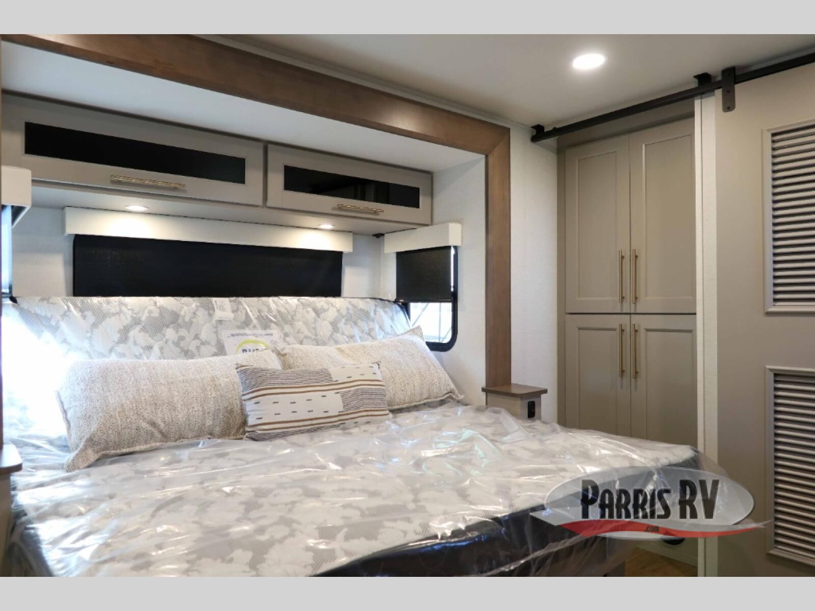 This destination trailer with a loft will be a favorite with the little ones! They will have three bunk mats to choose from plus wardrobes to keep their things picked up. You can take the rear private bedroom that includes a power tilting king bed that will allow you to sit up in bed at night to read. There is also a wardrobe, a dresser with a 32" TV, and a stackable washer and dryer to make laundry day easier than ever. A full bath with a 48" x 30" shower will let you freshen up each day, and there is a linen closet to keep clean towels close by. Everyone will enjoy spending time together in the front living area that includes a two dual recliner theater seats, a 50" TV and fireplace, and hidden storage for games or books. The chef of your group can make meals each day on the residential range and microwave, and there is a 110V Samsung refrigerator to keep your food fresh.