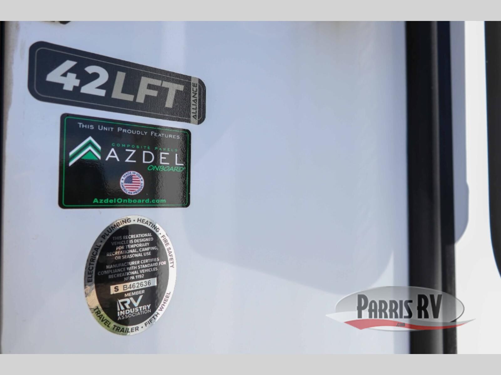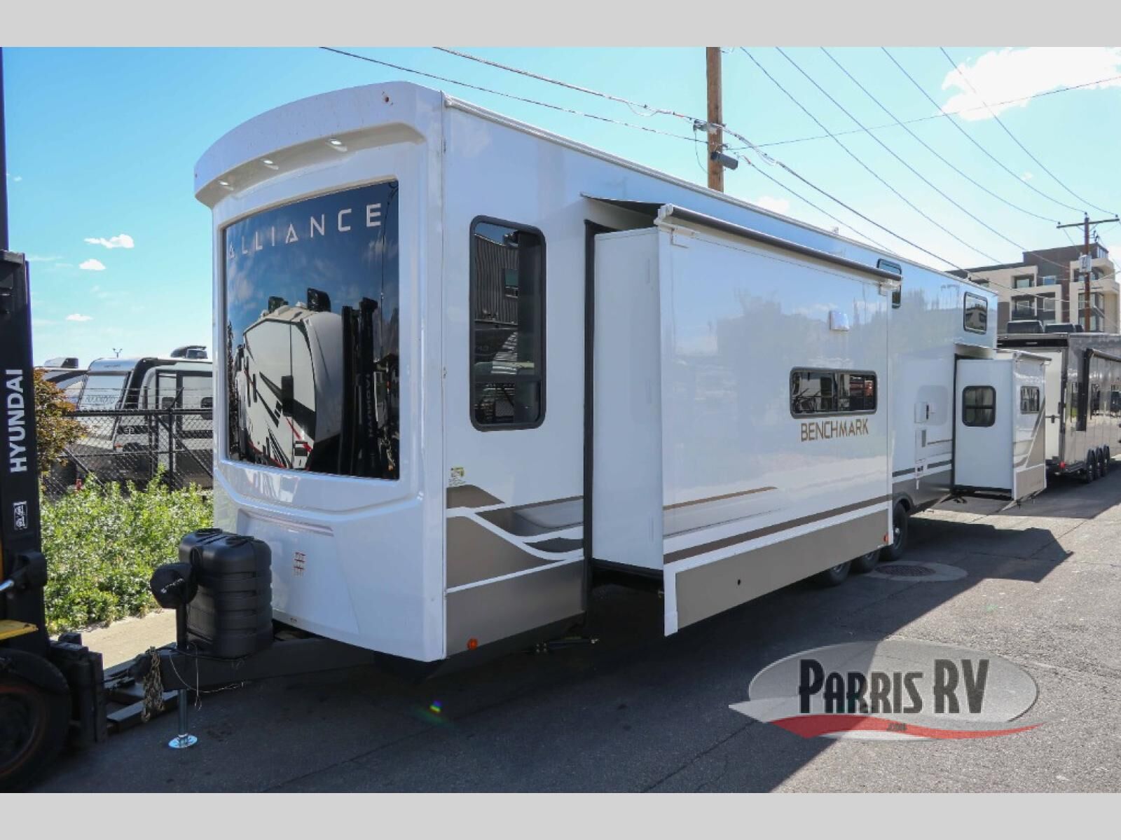 With any Benchmark destination trailer by Alliance RV, you will enjoy luxury features at every turn! The high gloss fiberglass exterior is ultra sleek, and the Azdel composite fiberglass sidewalls add durability so you can camp for years to come. You'll also find a residential exterior garden hose connection outside, along with a powder coated aluminum rear ladder, and an auxiliary LP tank hook up if you want to bring your grill along. Head inside to find hardwood cabinetry, solid surface countertops throughout, oversized windows in all rooms, and MCD roller shades throughout. The 45,000 BTU A/C and 60,000 BTU furnace will keep you comfortable year around, and there is a stackable washer and dryer to make full-time RV living easier than ever!