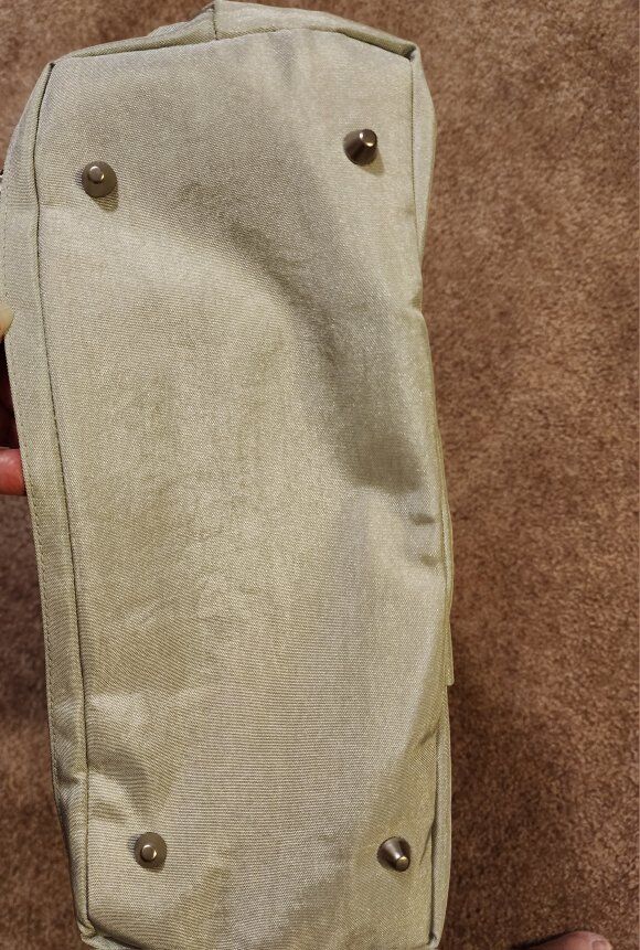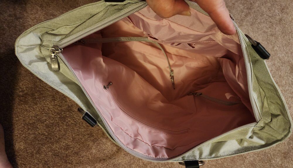 large lightweight, water resistant, light gray nylon with light pink interior. lots of pouches and zippered top. has outside zippered pouch that can be put over suitcase handle. about 17 inches across with bottom being almost 5 inches.