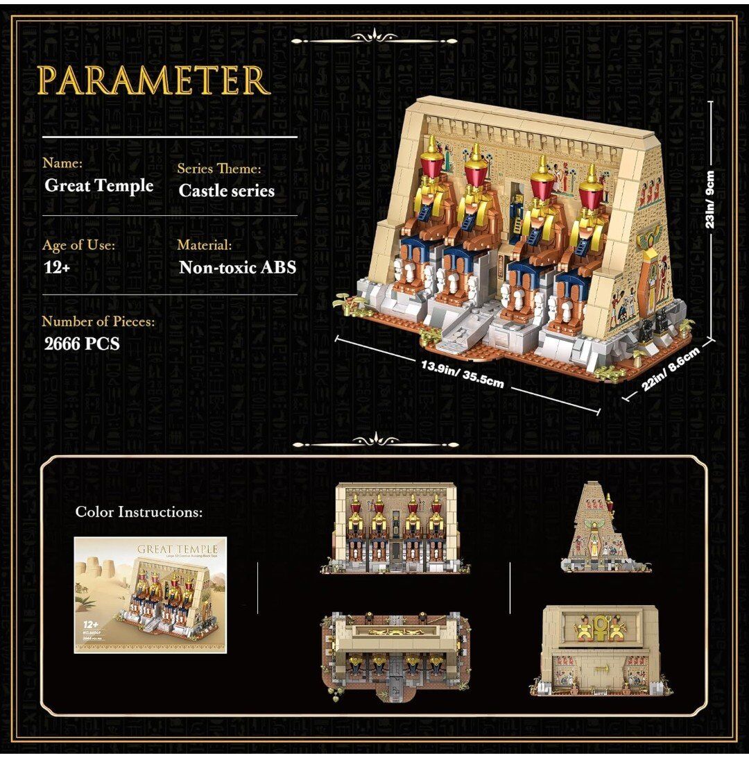 Sliding Doors and Hidden Mechanisms: The Egyptian building blocks are designed with sliding doors and hidden mechanisms that can be opened and closed, so that you can see the hidden details inside the temple. The meticulous design and ingenious mechanisms enhance the fun of the building process, allowing you to enjoy a more interactive and immersive experience. $40 OBO Text is best