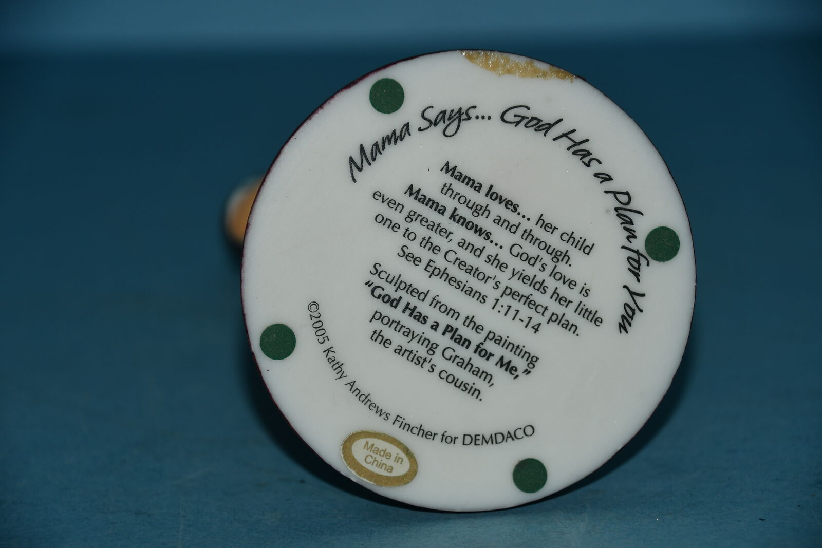 This VINTAGE 2005 DEMDACO "MAMA SAYS GOD HAS A PLAN FOR YOU" FIGURINE is about 6" in height. There are NO CHIPS! Our home is smoke free. Questions??? Please ask. We are located in Plain City. Cash only please.