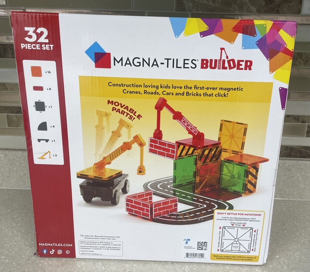 VenmoMAGNA-TILES BUILDER. The Builder 32-Piece Set Magna-Tiles is a set of 32 pieces that includes two magnetic cranes, 16 small squares, eight small rectangles, one spinner, four quarter circles, and one wheeled chassis. The magnetic cranes can swivel 360 degrees when attached to the spinner and are great for lifting tiles into place. This set is designed to promote mental growth in kids.