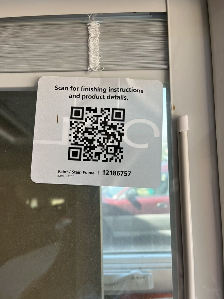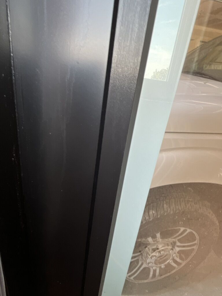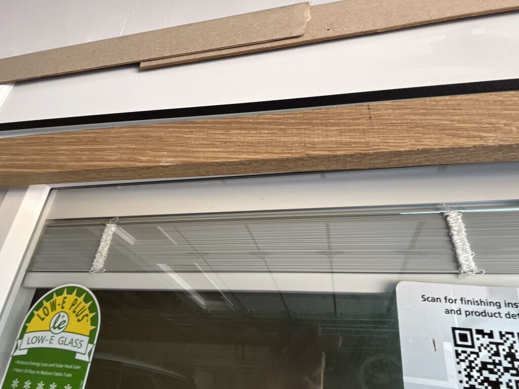 Interior is prefinished white, exterior black. May be able to be painted to color of choice. Blinds are inside glass installed. Comes with insect screen door.