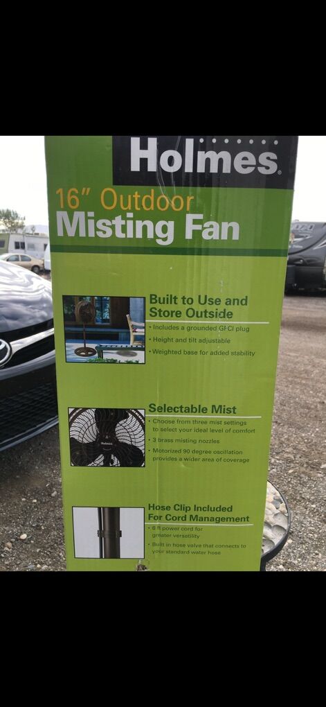 Brand New Holmes Outdoor Misting Fan. Never opened. Stay cool outside with this awesome misting fan. Save money.