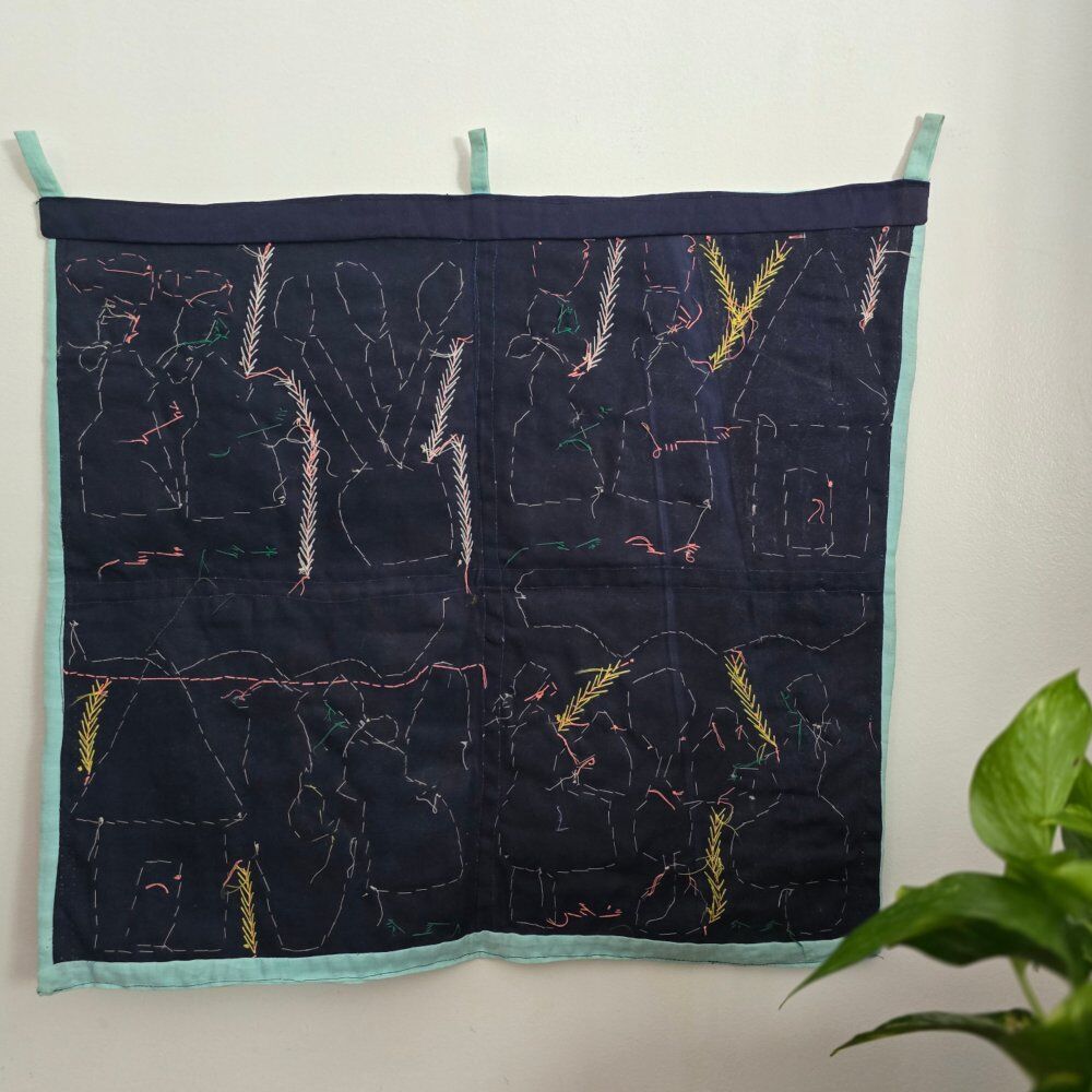 Hand sewn, depicting four scenes of village life Each panel is sewn with contrasting fabrics, sewn to be slightly raised from the base Three hang tabs make it easy to hang from a rod Spot clean only Width 24" x Length 23" Hang tabs are 3.5" front to back 1803
