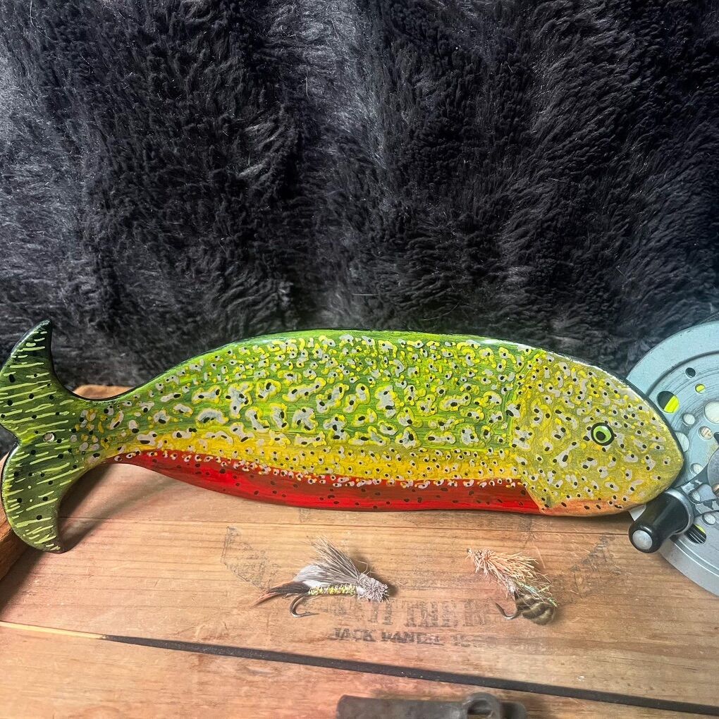 I used clay, paint, and resin. There are many layers to this fish that are best seen in hand.