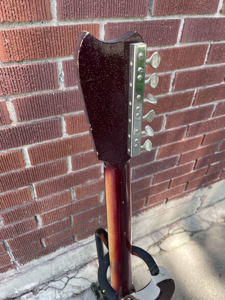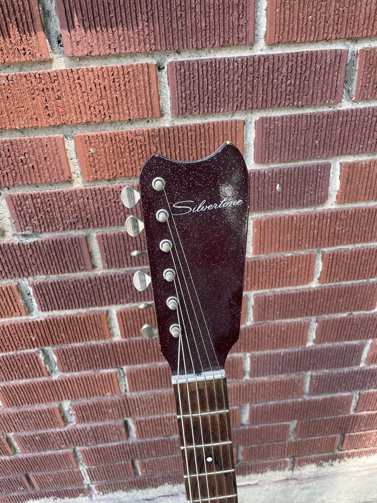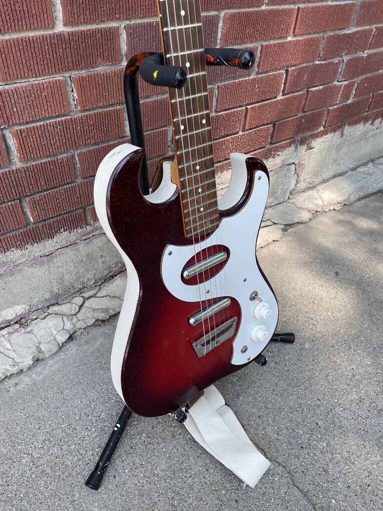 Vintage Silvertone 1457 guitar for sale. The guitar is in great condition for its age and is all original. The pickups sound fantastic, and it’s filled with 60s charm. The guitar does not come with a case, but it does have a matching strap which I assume is original to the guitar.
