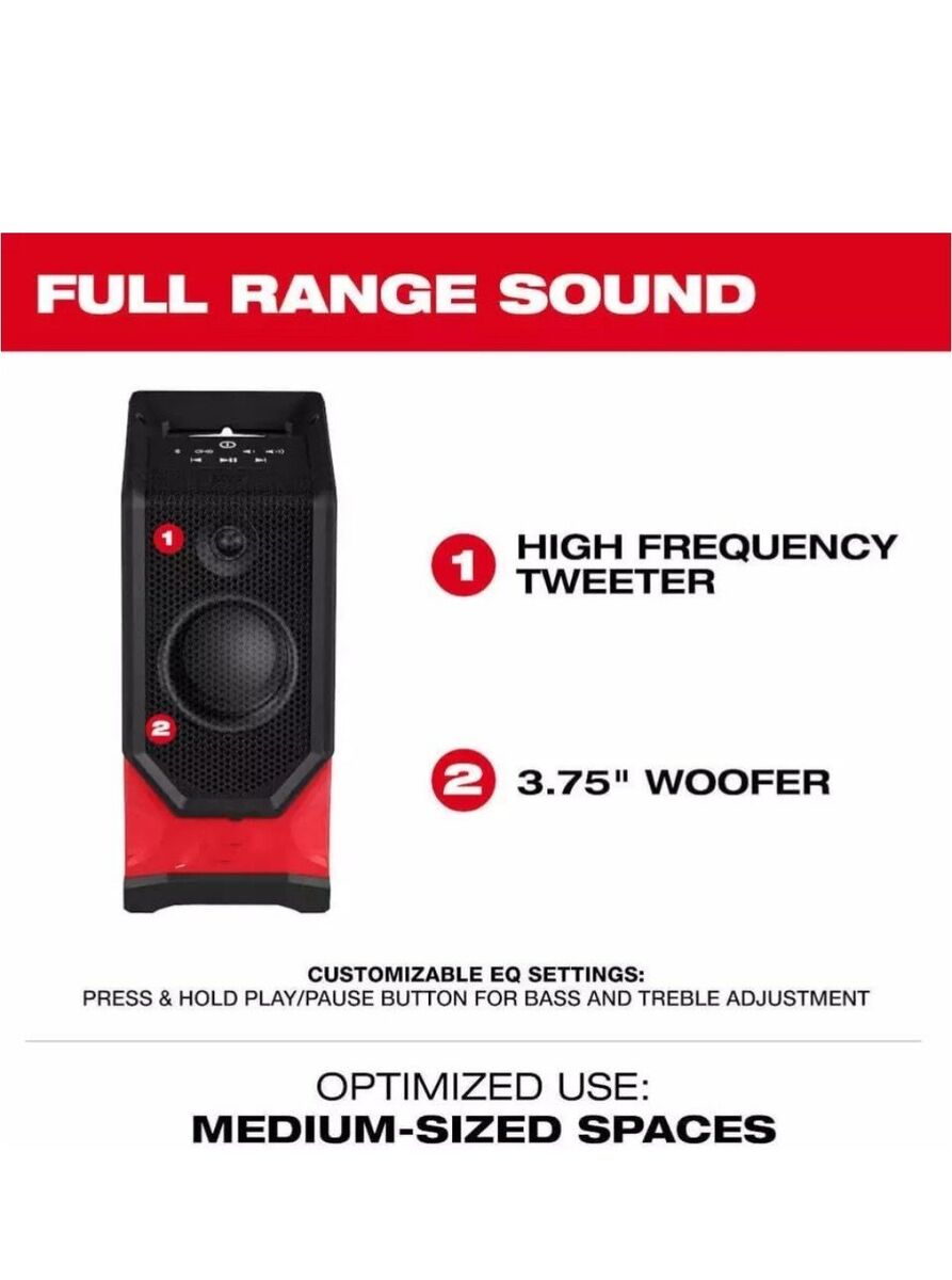 3.75” woofer and high frequency tweeter provide a FULL RANGE SOUND experience Fits Bluetooth 5.3 provides up to 200 feet of range Up to 18 hours of runtime for M18 XC5.0 battery at 100% volume Utility cart, nail hook and pass through hanging capabilities integrated within handle design USB-C 3.0A personal device charging IP64 Rated: dustproof and water resistant Impact Resistant Built-in equalizer settings allow you to customize the bass and treble to your preferred sound