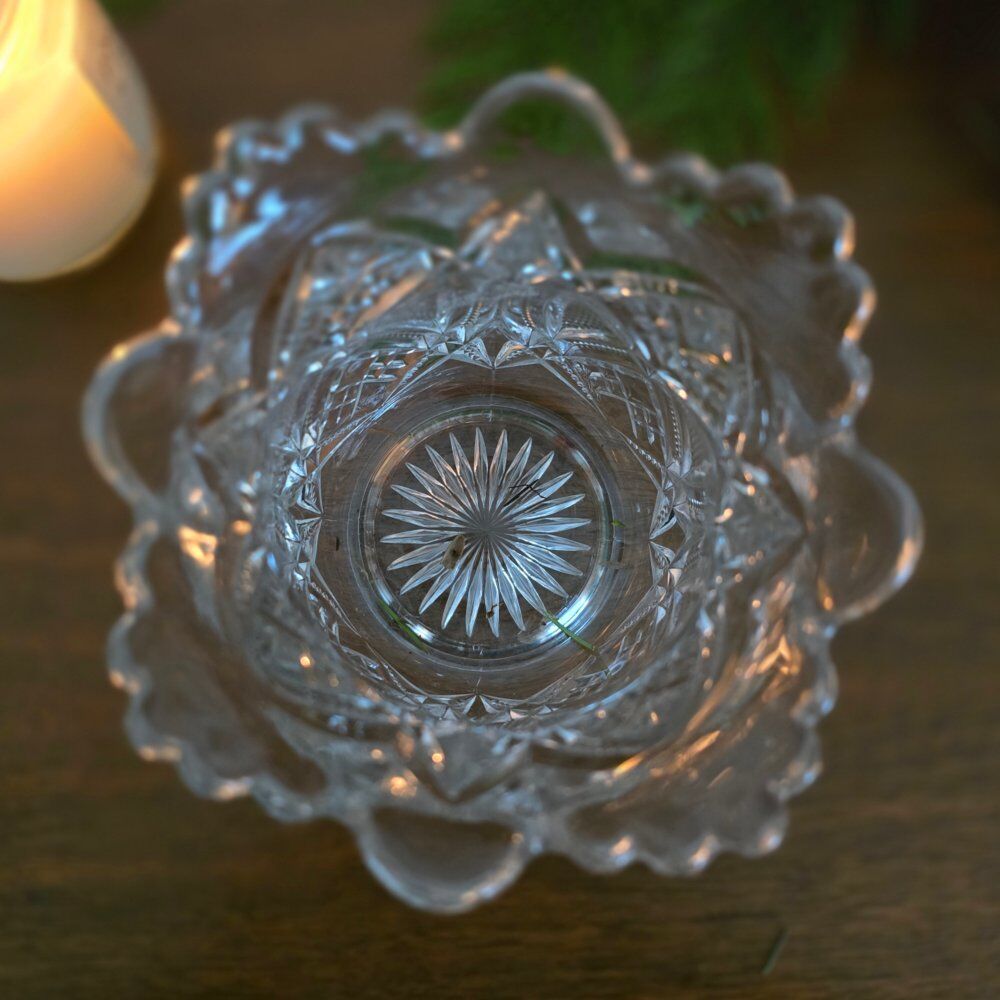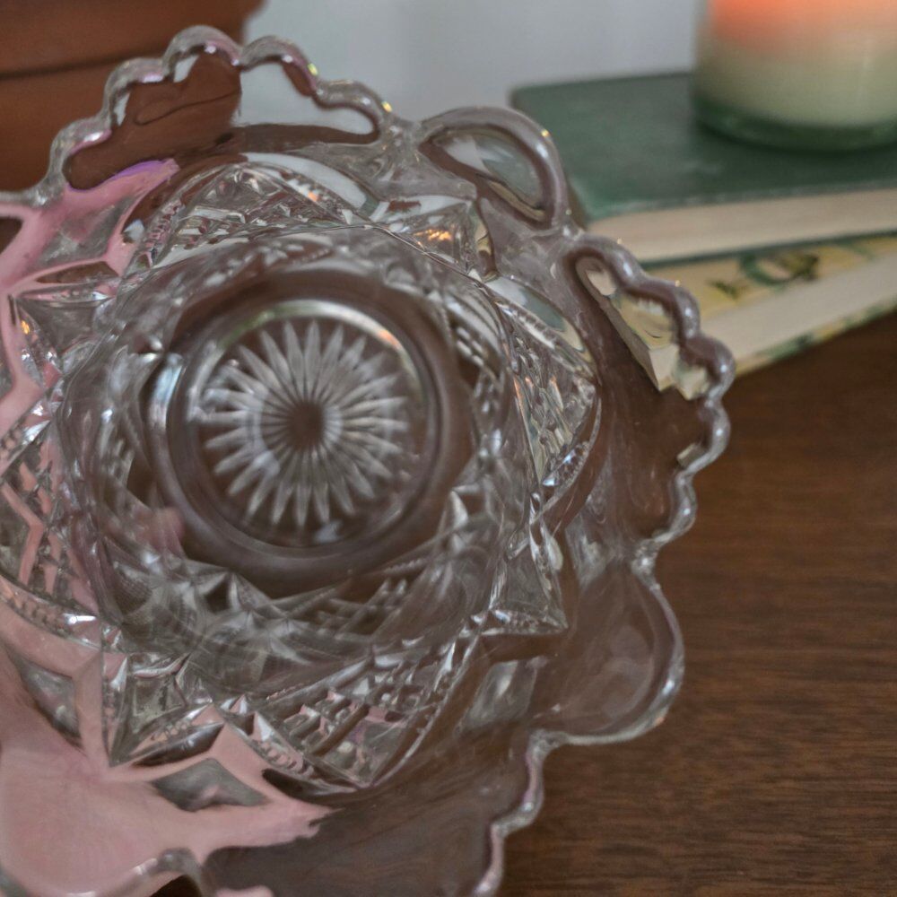 Identification: You can often identify cut glass by feeling the sharp edges of the cuts with your thumb, unlike the smoother surface of pressed or molded glass.