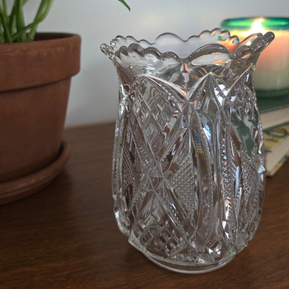 VenmoAntique American Brilliant Period cut glass celery vase, approx. 6" tall. Intricate deep-cut design with beautiful clarity and weight.