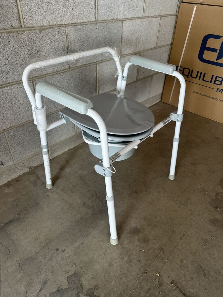 VenmoMedline Standard Steel - White - Commode only $15. New in box. Only have 10 left. Comes with seat, lid and bucket, and splash guard 350 lb. weight capacity, 14.5 seat depth, 19 width between arms, 21 overall width