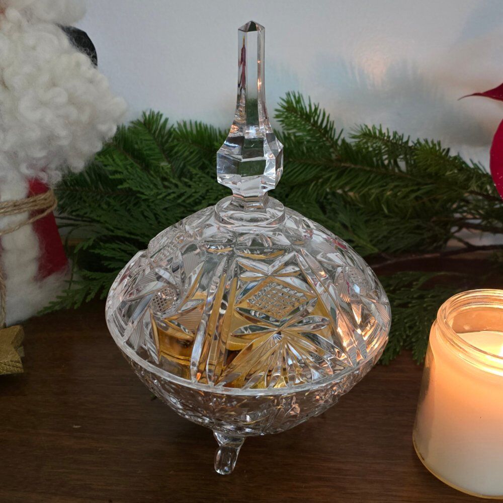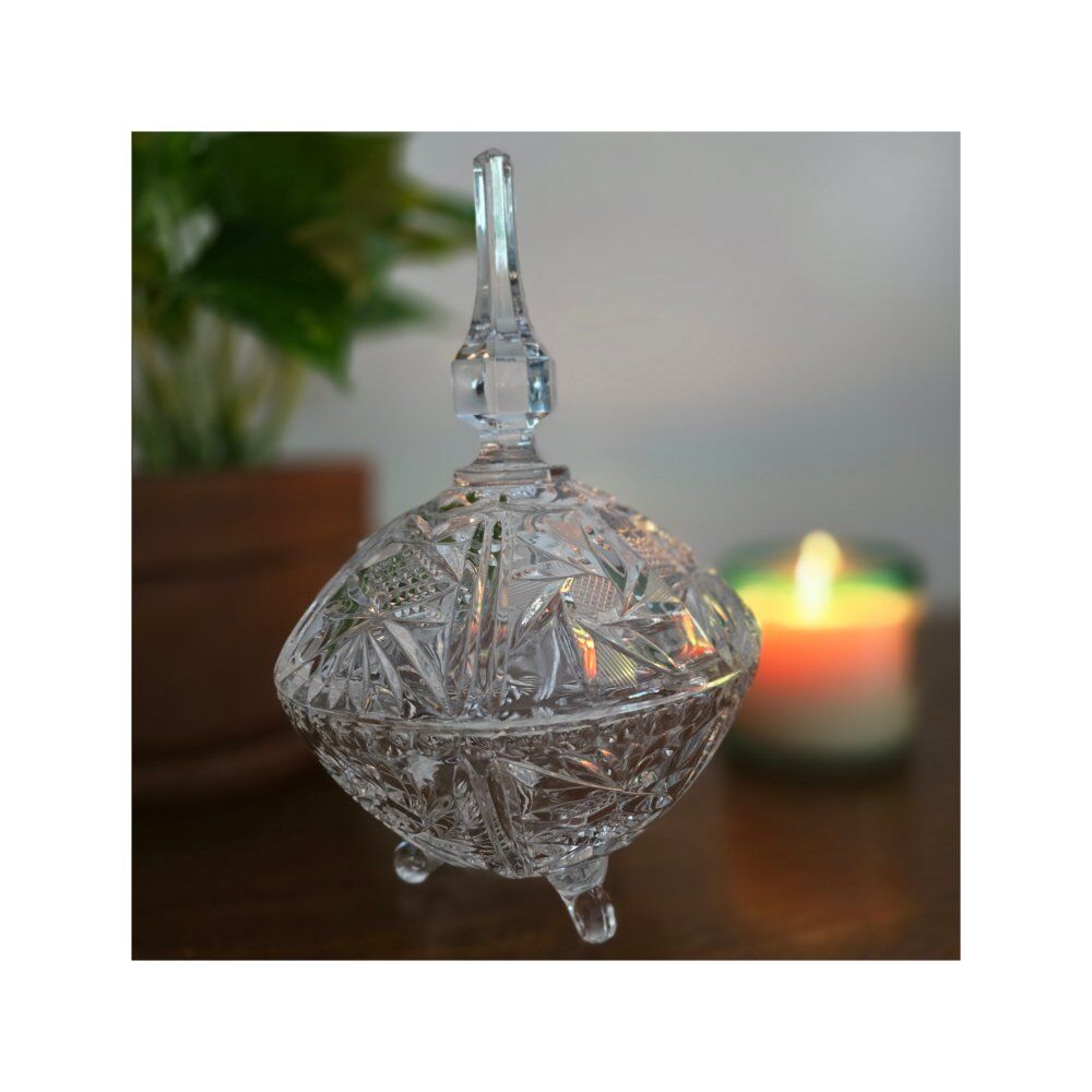 VenmoVintage cut crystal footed candy dish with lid and long handle. Excellent used condition.