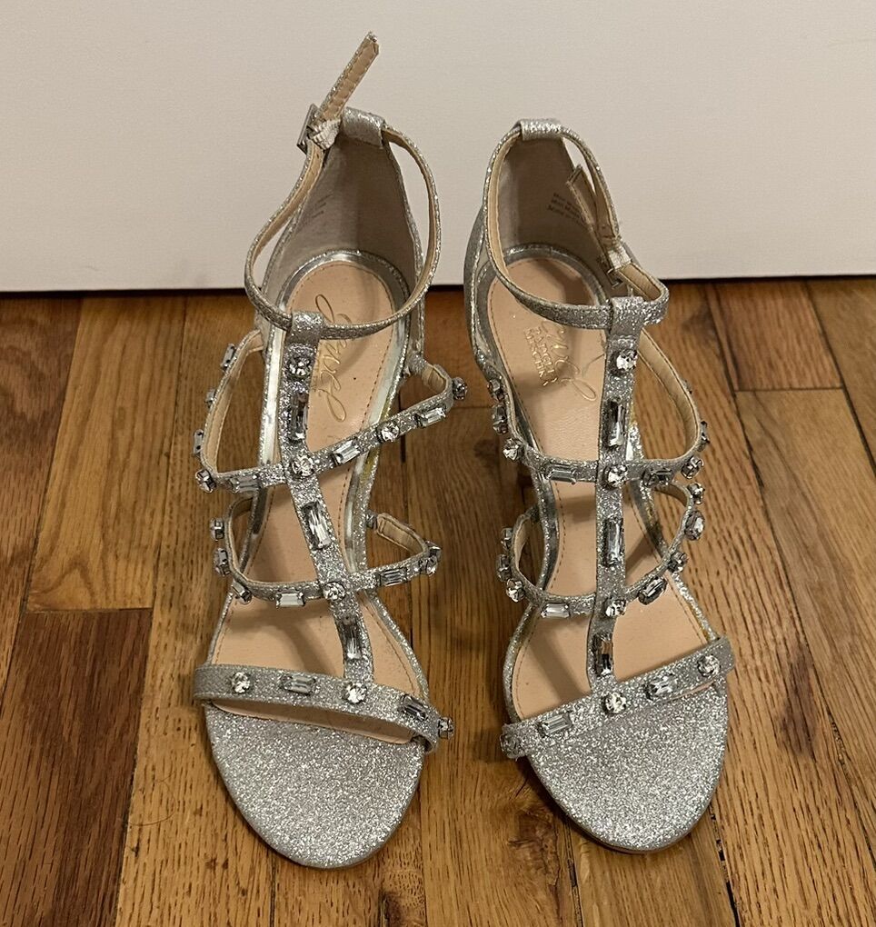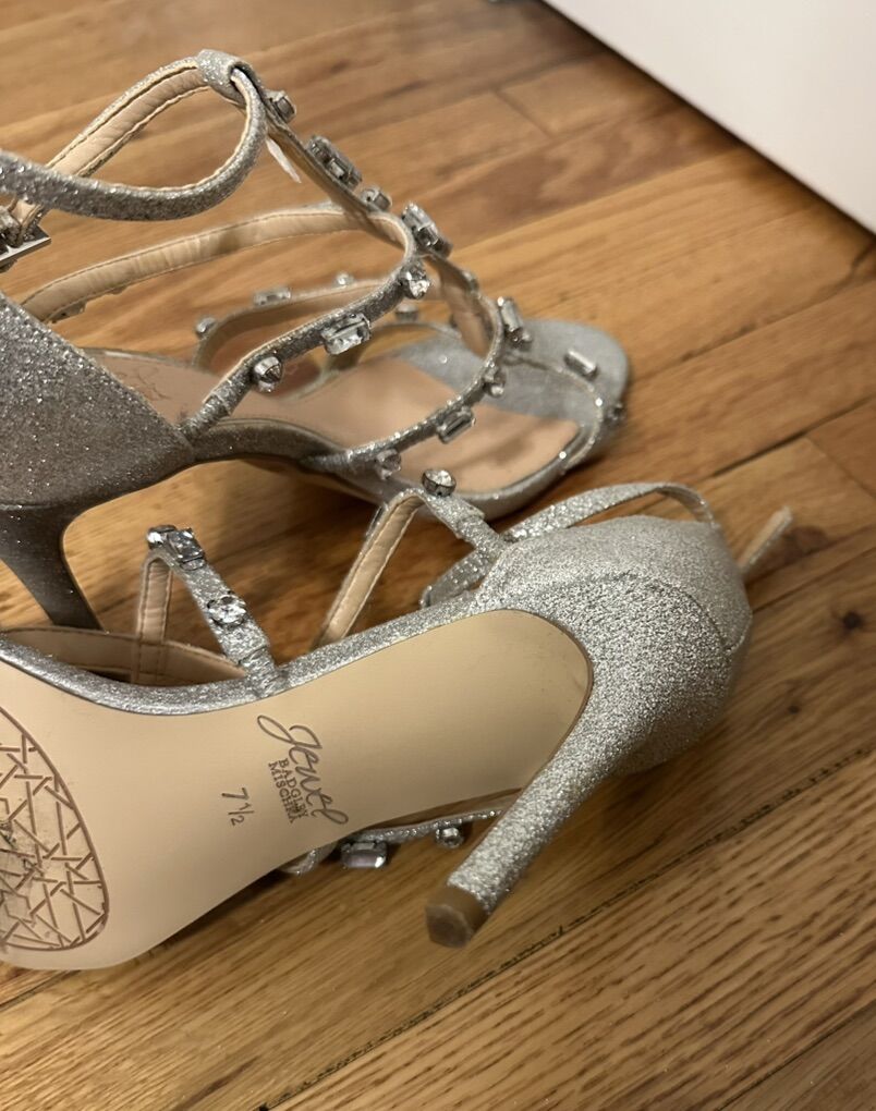 ApplePaySilver jeweled Badgley Mischka heels, size 7.5. Only worn one time. In great condition.
