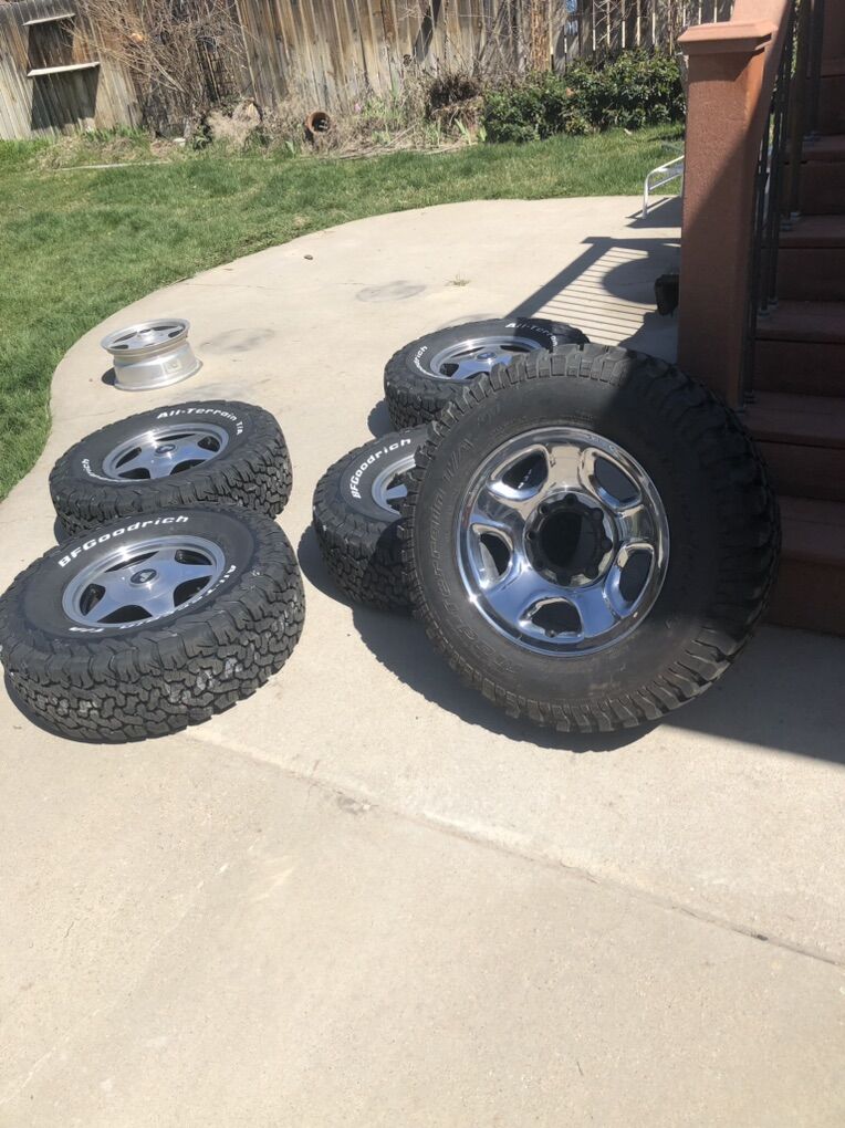 255/75R17 BF good rich mud and snow five tires also have four brand new Dodge rims chrome, steel, eight lug lug nuts, and center caps. Everything is new just been stored for a few years asking two grand or best offer.4780.00 retail best offer.1000.00 so far close on 2/1