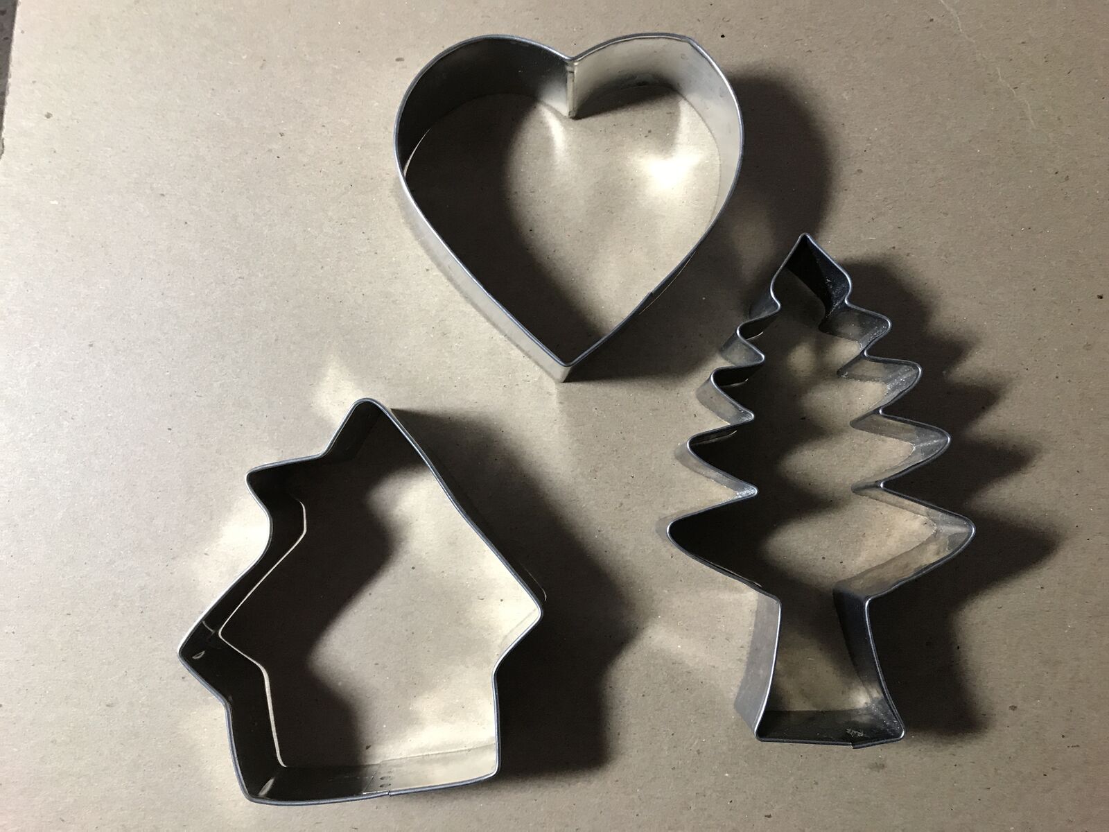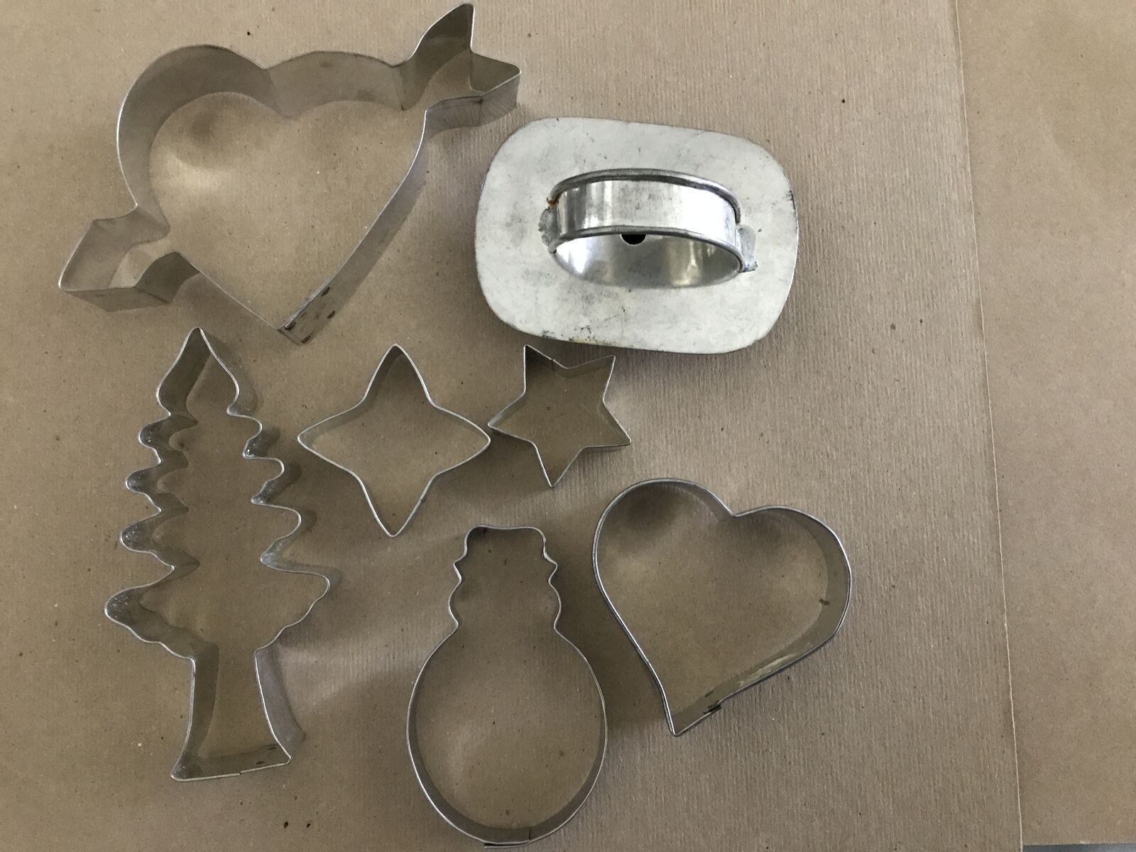 Cookie Cutters Heart With Arrow, 2 Pine Tree, Fish, 3 Hearts, Stars, Snowman, House, vintage. Last picture with pine tree the tree is 4 1/2" long.
