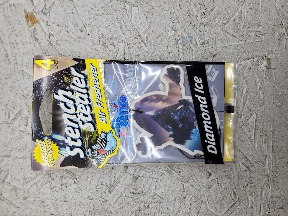 This listing features a collection of Diamond Ice Car Fresheners, packaged as a 24-pack with each pack containing 4 air fresheners. The Stench Stealer brand is known for its effective odor elimination, making it a great choice for refreshing your vehicle or any small space. Each air freshener is designed with a unique and appealing scent, ensuring a pleasant atmosphere. The fresheners are easy to use and can be hung or placed in various locations. Included in the listing is a can of Coca-Cola for scale. Perfect for those looking to keep their car smelling fresh or for gifting to friends and family.