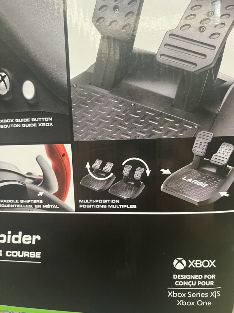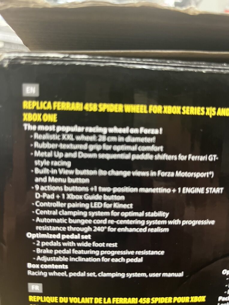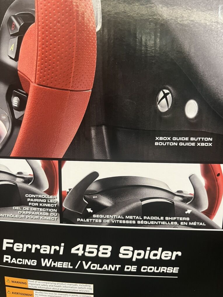 Description Race in style with this 7:10 replica of the Ferrari 458 Spider racing wheel. The realistic wheel has a bungee cord mechanism that keeps constant resistance regardless of turning angle, and the adjustable wheel sensitivity makes it easy to control your favorite game without difficulty. Features & details The most popular racing wheel on Forza. Easy to use: official plug-and-play Xbox racing wheel with USB recognition. Works on Xbox Series X/S & XBOX One Comprehensive controls for all driving actions, with 9 action buttons, 1 Manettino dial, 1 D-pad, 1 Xbox Guide button and 1 pairing detection LED for Kinect. Wheel is 11 inches / 28 cm in diameter — a 7:10 scale replica of the wheel on the real Ferrari 458 Spider sports car. 2 Up and Down sequential paddle shifters: 100% metal.