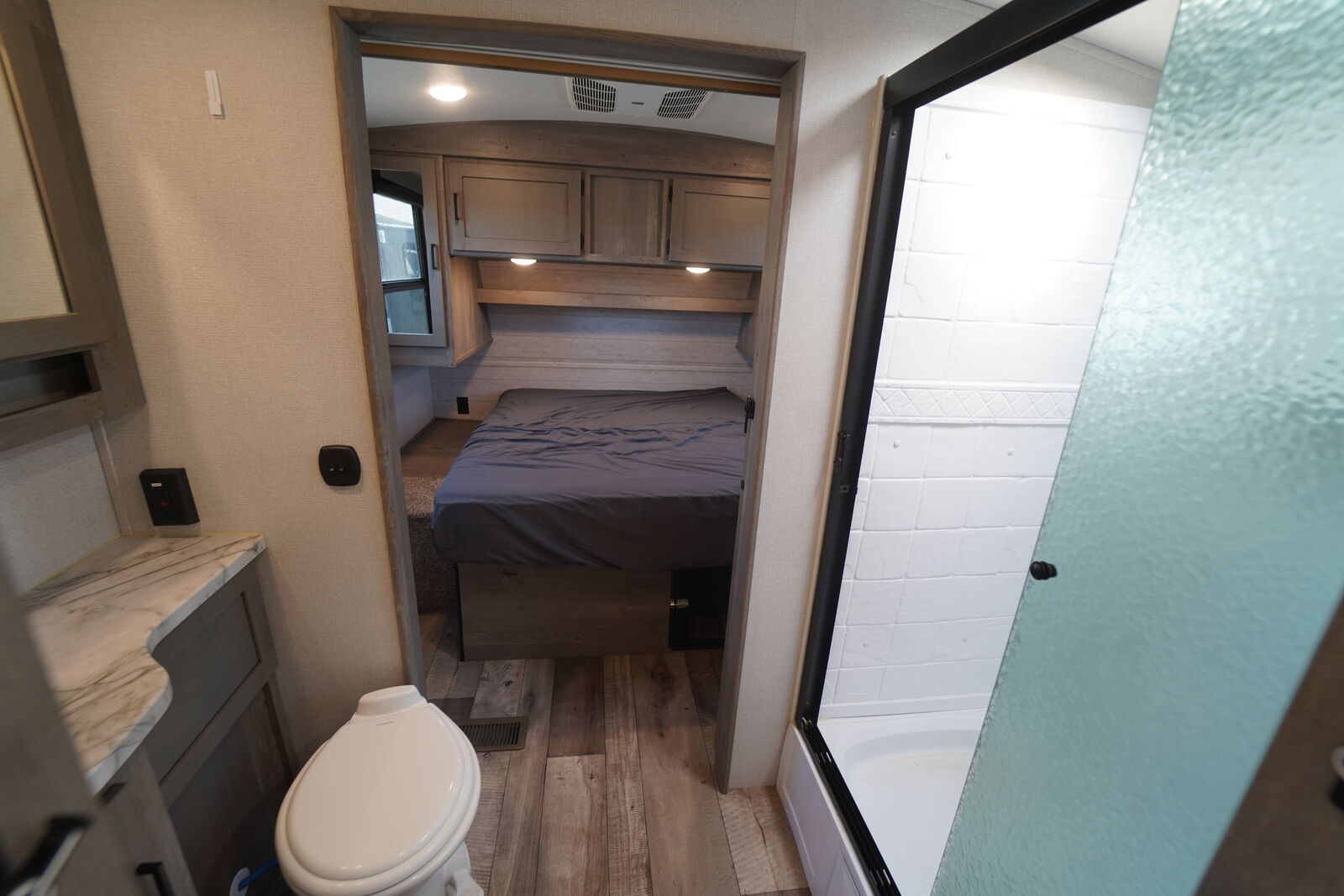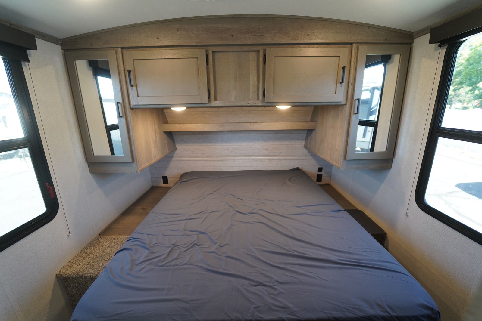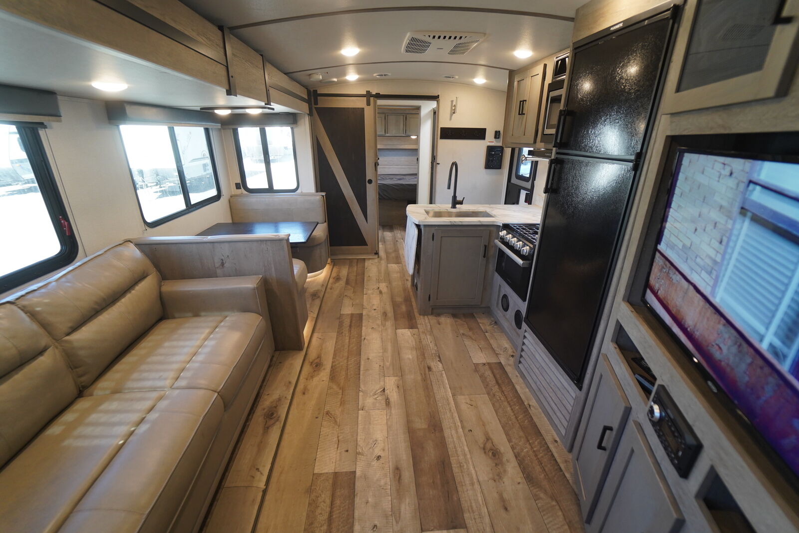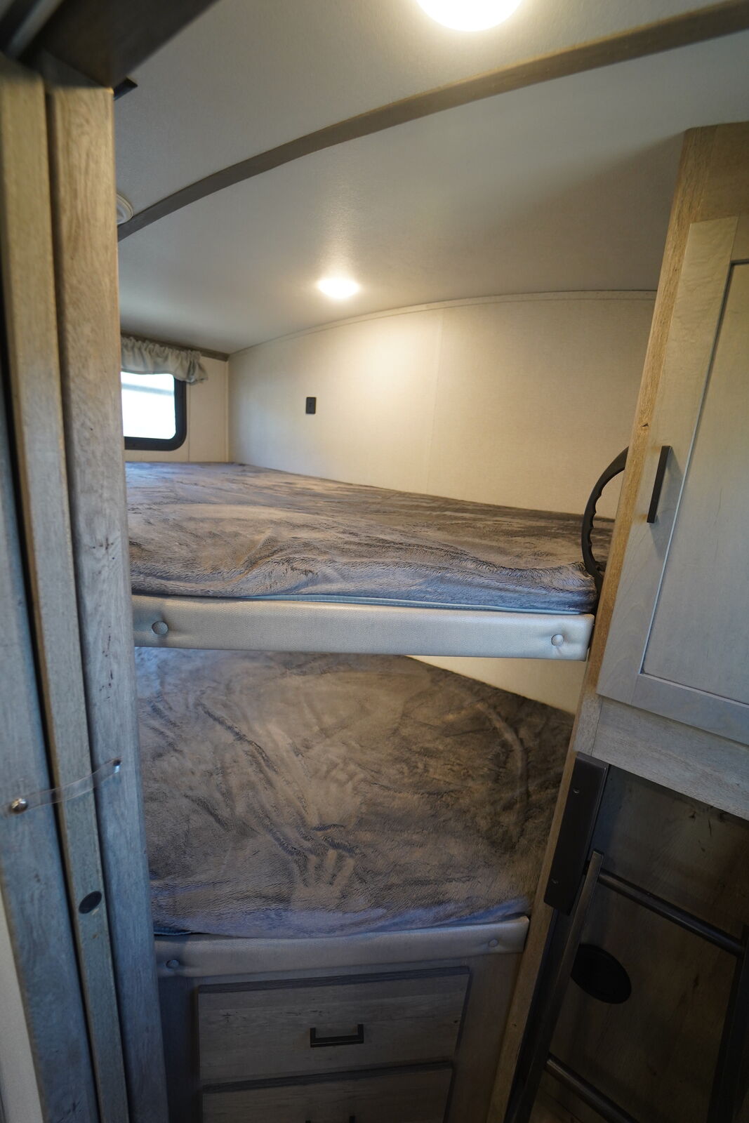 AMAZING FLOORPLAN – they thought of everything! The front queen walk around bed has a BUILT IN PET CRATE! The bathroom is MASSIVE and features SUPER WIDE DOORWAYS and a glass enclosed sliding shower door; the mid-living area features AN ENTERTAINMENT AREA THAT IS HINGED AND SWINGS OUT TO ACCESS THE GINORMOUS PANTRY! The rear double over double bunks are lined against the back wall and close off by a pocket door, creating a 2nd BEDROOM!