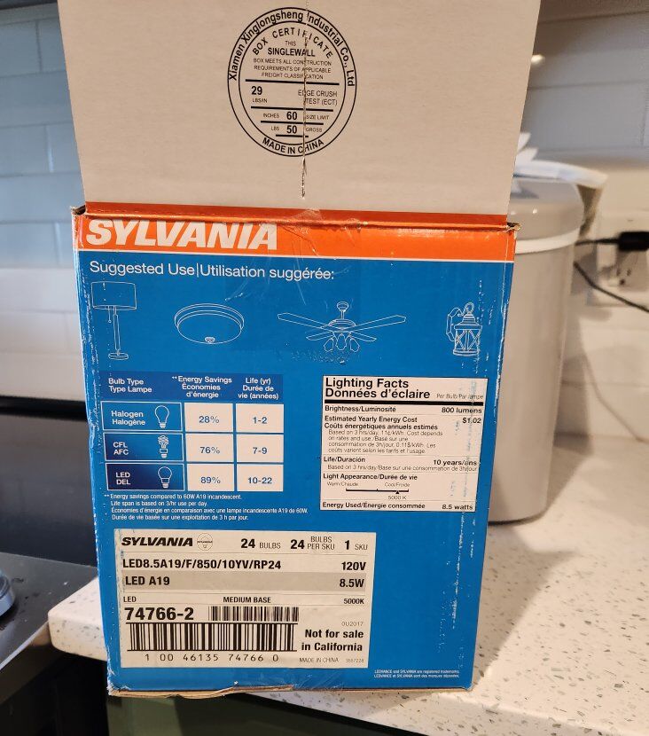 Sylvania LED A19 Light Bulb, 60W Equivalent, Efficient 8.5, 10 Year, W, 5000K, 800 Lumens, Frosted & Sylvania ECO LED Light Bulb, A19 60W Equivalent, Efficient 9W, 7 Year, 750 Lumens, 2700K Original $55 *ONLY 16 in the box. Selling for $30