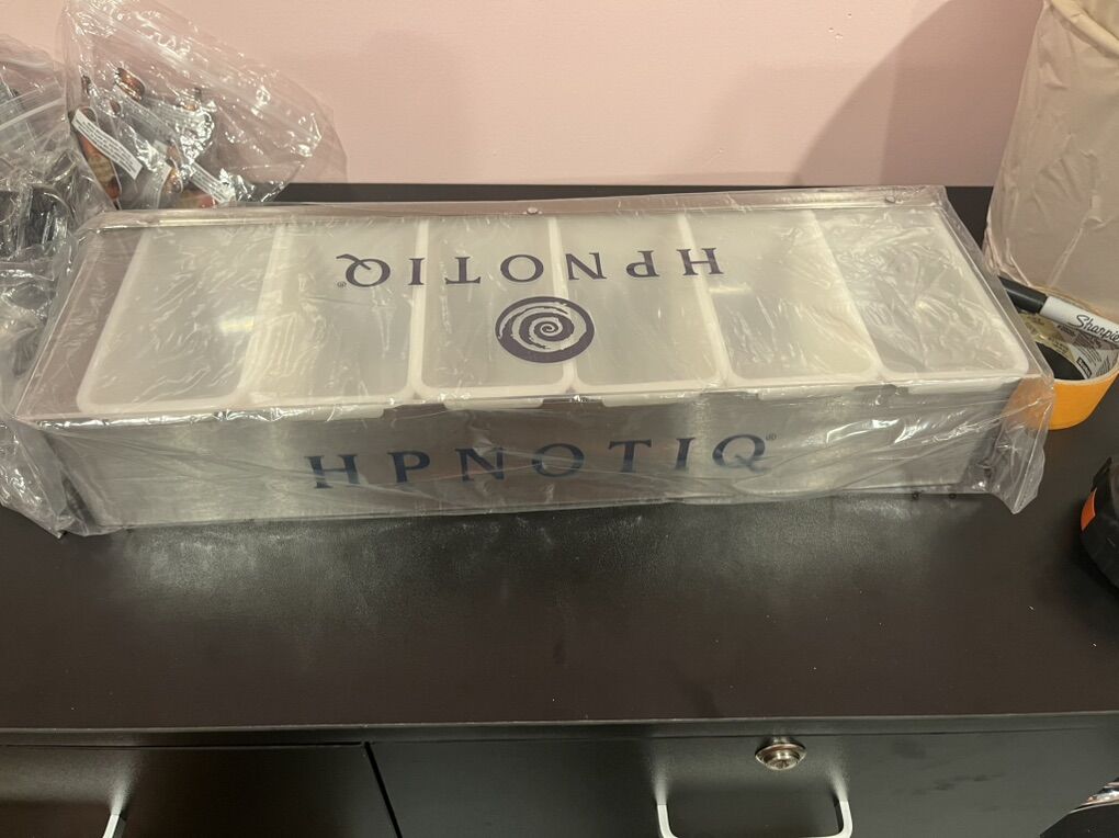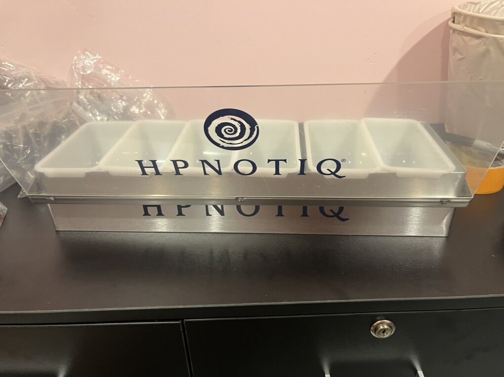 VenmoBrand new taken out of box for photo’s. Hpnotiq condiment holder that has 6 new containers with a lid that lifts up or lays down to cover them. Silver with blue writing.